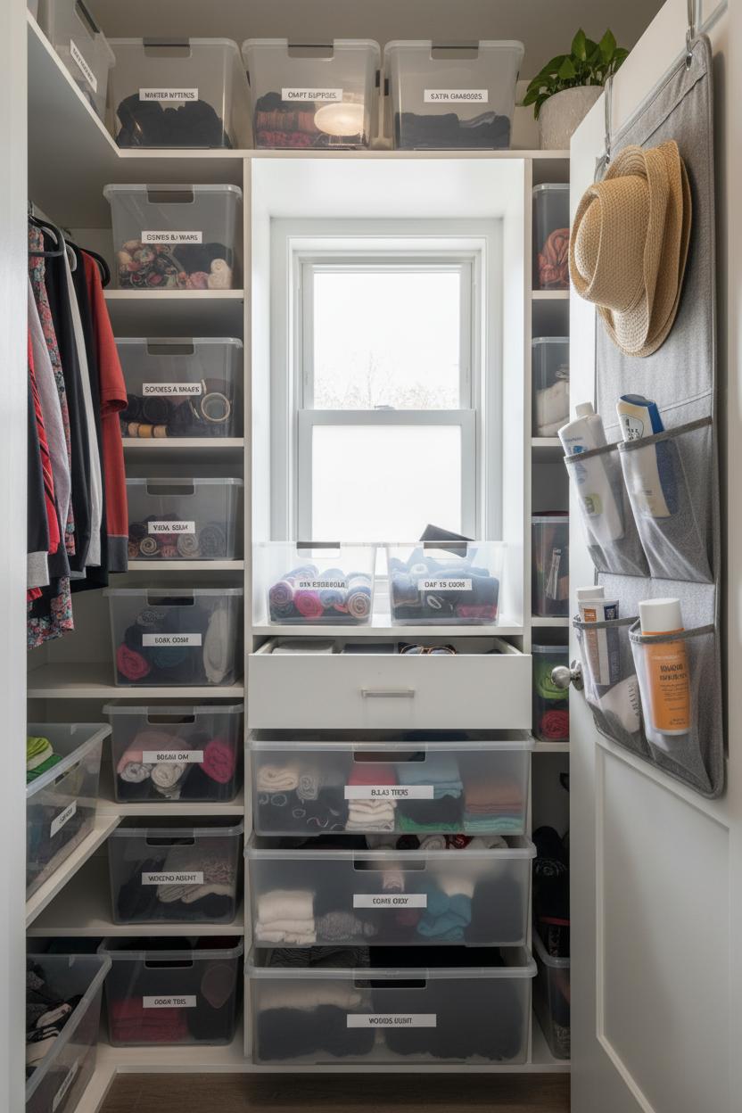 In closets, clear bins behave like a built-in closet organizer without the contractor. Corral scarves and belts, keep workout gear together, or dedicate a bin to “out the door” essentials so mornings are smoother. If your door has vertical real estate, an over the door organizer can hold hats, sunscreen, and lint rollers while bins tackle the bulkier categories. For drawers, pair smaller clear bins with drawer dividers to stop the jumble—socks, tights, and tees will line up neatly, and you’ll find what you need in seconds. Here’s a tiny-room trick: label by activity (Beach, Gym, Movie Night) instead of just item type. It’s one of those decluttering tips that makes maintenance feel natural.