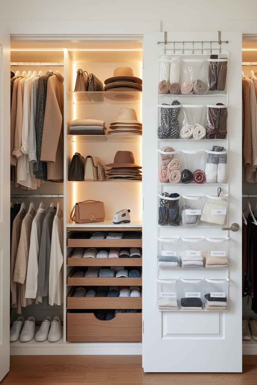 If your closet feels more like a jigsaw puzzle than a wardrobe, a few strategic upgrades can make it feel twice as big. Start by rethinking the vertical space: add a second hanging rod for shirts and skirts, then reserve the top rod for dresses and coats. Swap bulky hangers for slim, non-slip ones to instantly gain inches. On the shelves, slide in shelf risers so sweaters, handbags, and hats get their own neat tiers instead of tipping into a pile. The back of the door is prime real estate—an over the door organizer can cradle shoes, scarves, clutches, or even gym gear you reach for daily. Hook a few S-hooks on a tension rod for belts and bags, and suddenly your small space storage starts to feel intentional, calm, and surprisingly roomy—exactly the vibe of smart home organization ideas.