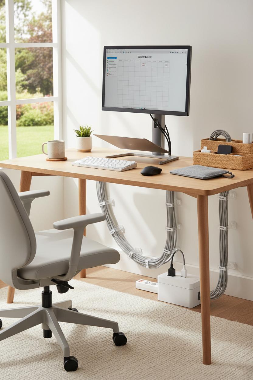 Take a breath, tug the chair in, and give your cords five focused minutes. Start by gently pulling everything to center so you can see what you’re working with—no judgment, just a quick reset. A few loops with reusable ties instantly turn chaos into clean lines, and suddenly your desk feels like a minimalist workspace instead of a tech jungle. Think of it as styling your cables the way you’d style a coffee table: intentional, calm, pretty to look at. Quick cable management is one of those underrated productivity tips that removes visual noise you didn’t realize was buzzing in the background, making room for clarity and a little spark of motivation.