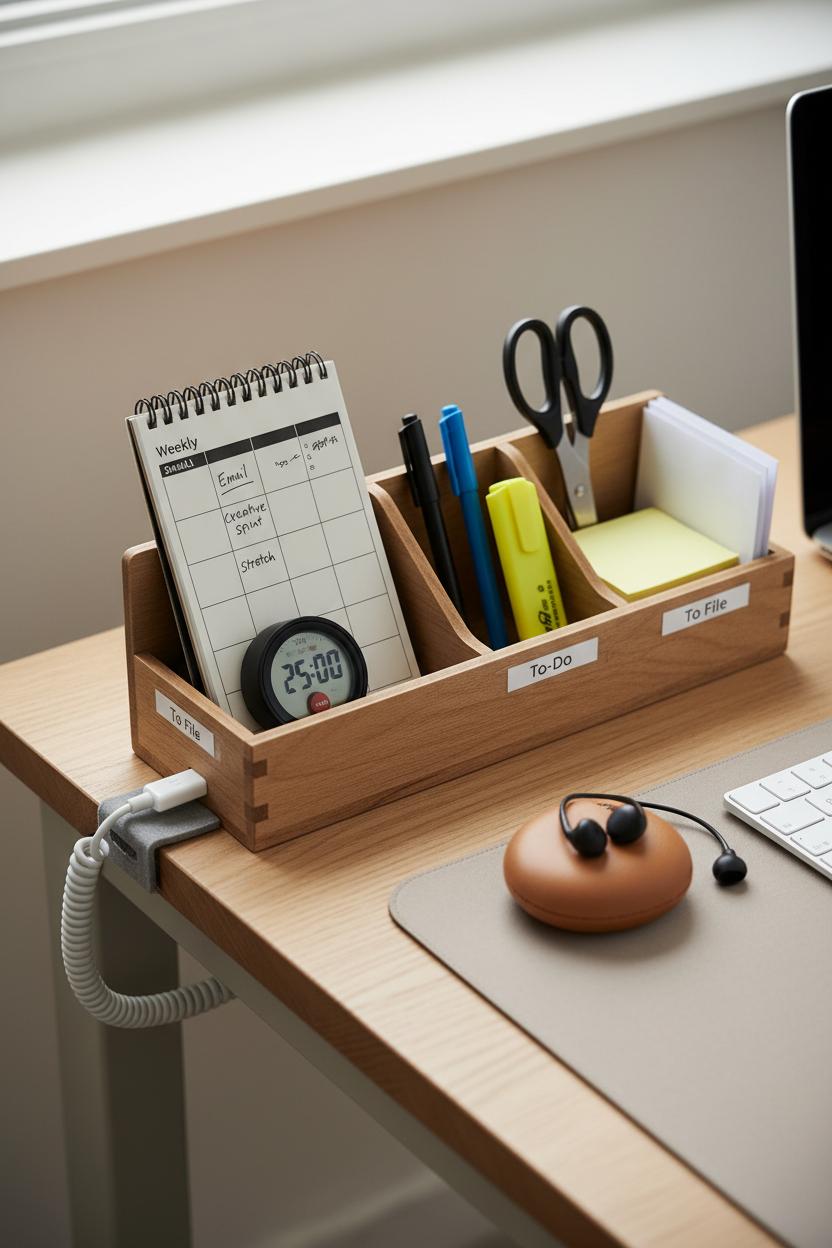Keep your weekly planner propped open in the front slot, so your day starts with clarity. Use it to sketch gentle time blocking: a block for email, a creative sprint, a quick stretch, a wrap-up. This is one of those productivity tips that feels almost too easy—when your plan sits within reach, it gets used. Add a small timer beside it to protect those blocks; set 25 minutes, press start, and let your focus settle while everything you need is a fingertip away. The beauty of this little system is that it supports a minimalist workspace without being sterile—just enough structure to guide you, not boss you around.