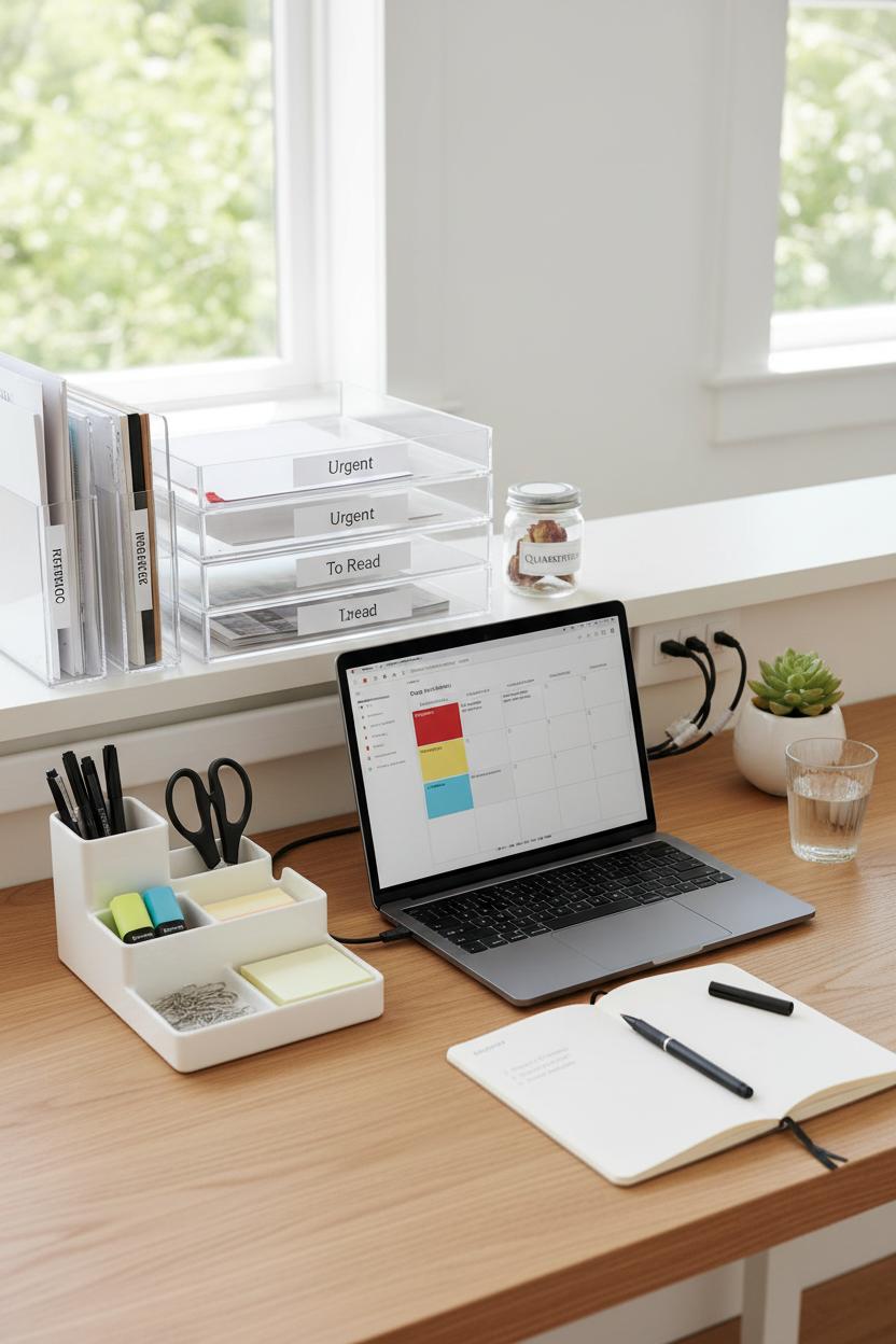 Think of this as your five-minute magic trick: corral the essentials into a slim desk organizer and let a label maker do the rest. Slide in your favorite pens, a small stack of sticky notes, a pair of scissors, and a highlighter that actually sparks joy. Then tap out tidy labels—“Inbox,” “To-Do,” “To File,” “Mail”—and stick them on the compartments so your hands know where to land without thinking. That soft click of the label maker is your cue that clutter has boundaries now. For the final flourish, tame visual noise with simple cable management: tuck chargers into a sleeve, clip the laptop cord along the edge, and coil earbuds in a tiny case. Suddenly, your surface breathes again, and your brain follows.