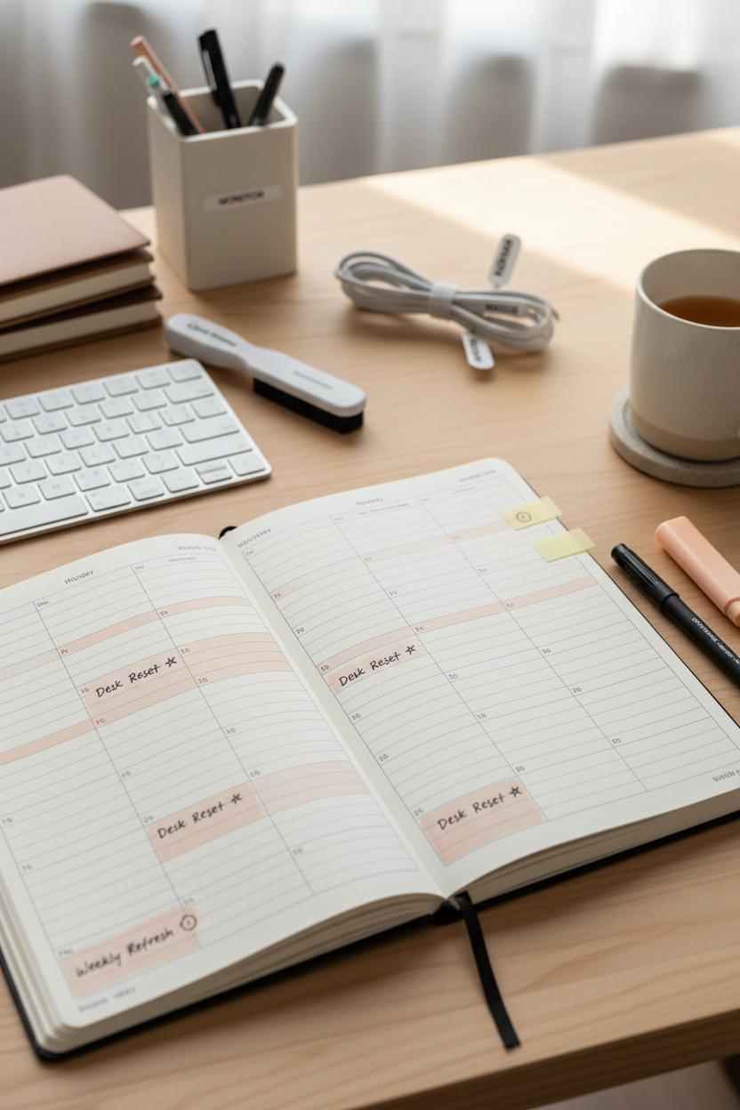 Open your weekly planner and give your 5-minute reset a real home. Time blocking is simply making an appointment with your future self, and this tiny meeting is one that pays off all week. Scan your schedule and pick anchor points that repeat in your daily routine—right after your first coffee, before lunch, and five minutes before you log off. Write “Desk Reset” in those slots, add a little star or a pastel highlight, and treat it like brushing your teeth: non-negotiable, quick, and oddly satisfying. If you use a digital calendar, set a gentle chime; if you’re a paper person, a slim sticky tab works wonders. This is one of those productivity tips that removes decision fatigue—you don’t wonder when to tidy, you just follow the plan.