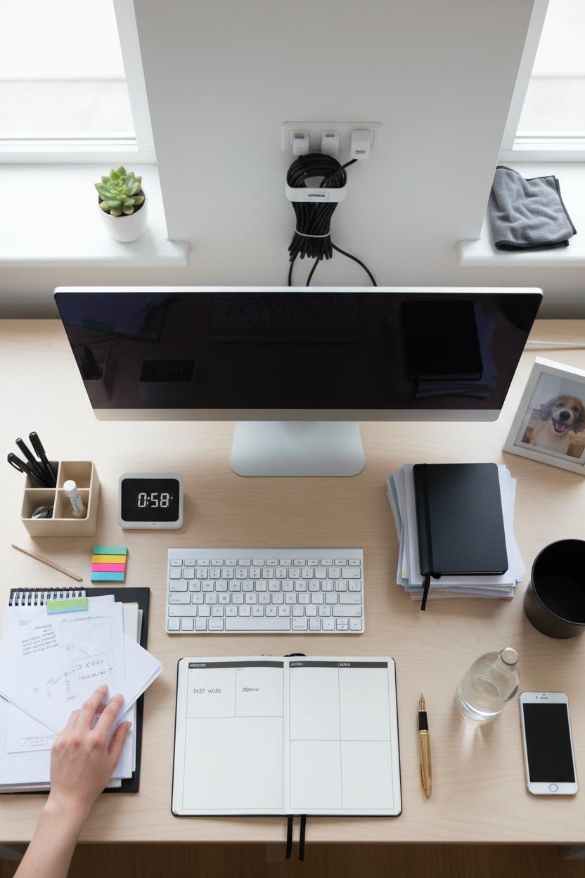 Now tame the tangles: scoop cords into a quick loop and clip them to the back edge for effortless cable management; when you have a second later, a label maker can tag each charger so you never guess which is which. Keep just one pretty pen, your water, and today’s single project within reach for a minimalist workspace that feels calm and intentional. Open your weekly planner and carve out a sliver of time blocking—literally two boxes: “Deep Work” and “Admin.” Knowing where your attention goes next prevents the creep of clutter from sneaking back in. As a final flourish, wipe the surface with a microfiber cloth, set your phone face down, and place one feel-good object (a tiny plant or photo) where it makes you smile. That’s your daily routine anchor: one minute to reset, many more minutes saved later. When the timer dings, you’ve created breathing room, reclaimed momentum, and turned desk organization into a habit that supports you—even on the busiest days.