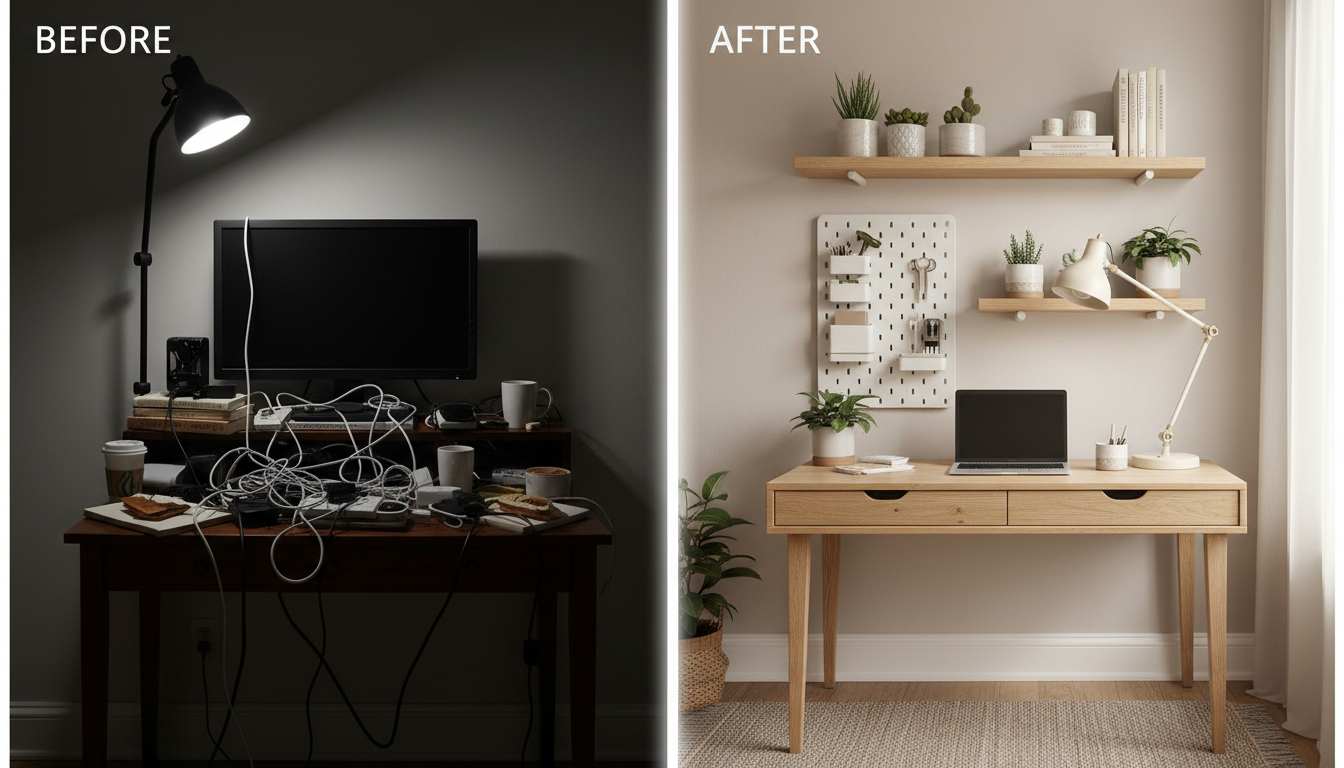 Ready for a before-and-after that proves a small space desk can shine? This desk makeover turned a cluttered corner into a calm, high-functioning home office makeover—packed with smart workspace ideas and simple organization hacks. See how floating shelves and a pegboard organizer lift supplies off the surface, an LED desk lamp brightens without bulk, and a cable management tray tames the cords. Drawer organizers keep daily essentials tidy, while the layout maximizes every inch. Pin now, design later—your glow-up starts here.