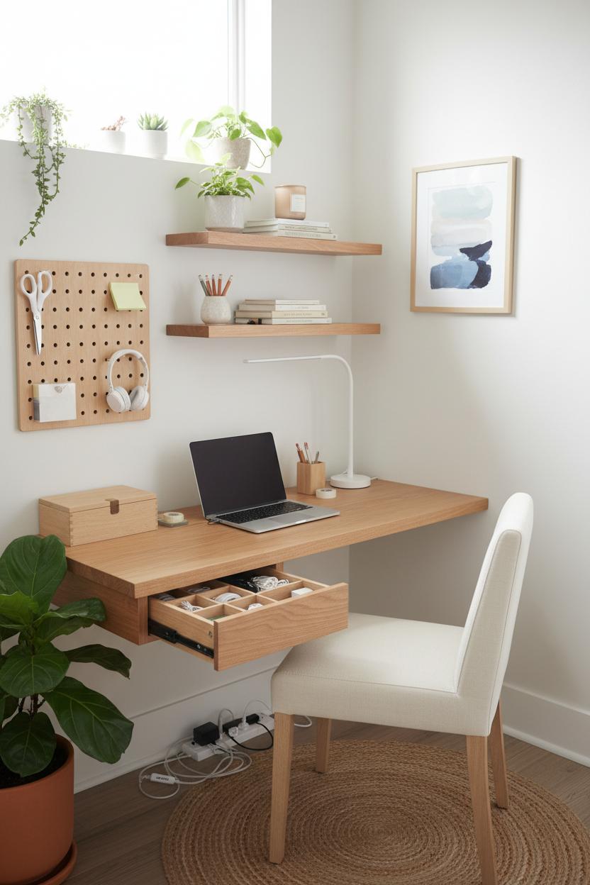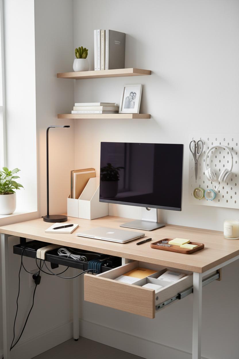 Zooming in on the problem areas helped set the tone for this home office makeover. Paper had no home, so it wandered. Tech lived out in the open, so visual noise ruled. The single drawer was chaos; the floor became a charging station overflow; and vertical space was totally ignored. I started jotting down workspace ideas: go up, not out; carve out zones; hide the tangle, show the pretty. That means adding floating shelves for the things I want to see and a pegboard organizer for the things I need to grab fast. A slim LED desk lamp to light the work, not the room. A cable management tray to scoop up the spaghetti under the surface. Drawer organizers to stop the endless rummaging. These tiny shifts felt like the kind of practical organization hacks that actually stick, especially in tight quarters.