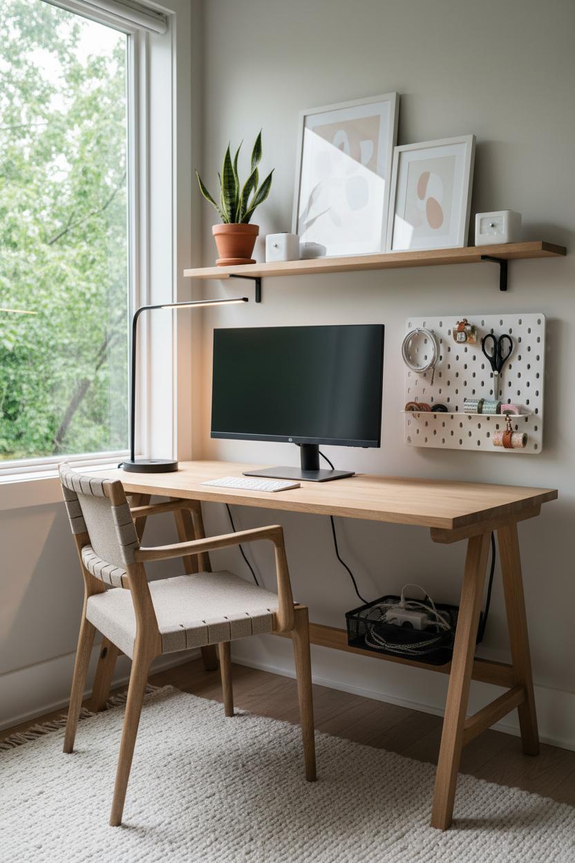 When a room is short on square footage, placement is everything. For this desk makeover, I started by mapping the movement in the room: door swing, window light, the path my chair takes in and out. The sweet spot ended up near the window, angled a few degrees so the view is energizing but screen glare is minimal. If you’re working with a small space desk, give yourself at least 24–30 inches behind the chair for a smooth slide-back, and shift the tabletop three inches off the wall to sneak cords behind. A petite rug under the front legs of the desk anchors the zone and instantly reads “intentional workspace,” even in a multipurpose room. Keep your “reach triangle” tight—keyboard, mouse, notepad within 18 inches—and let everything else go vertical. Floating shelves above pull the eye up and free the desktop, while a pegboard organizer beside the monitor keeps scissors, cables, and washi within an arm’s swoop. The result is a flow that feels airy, not cramped—exactly what a home office makeover should deliver.