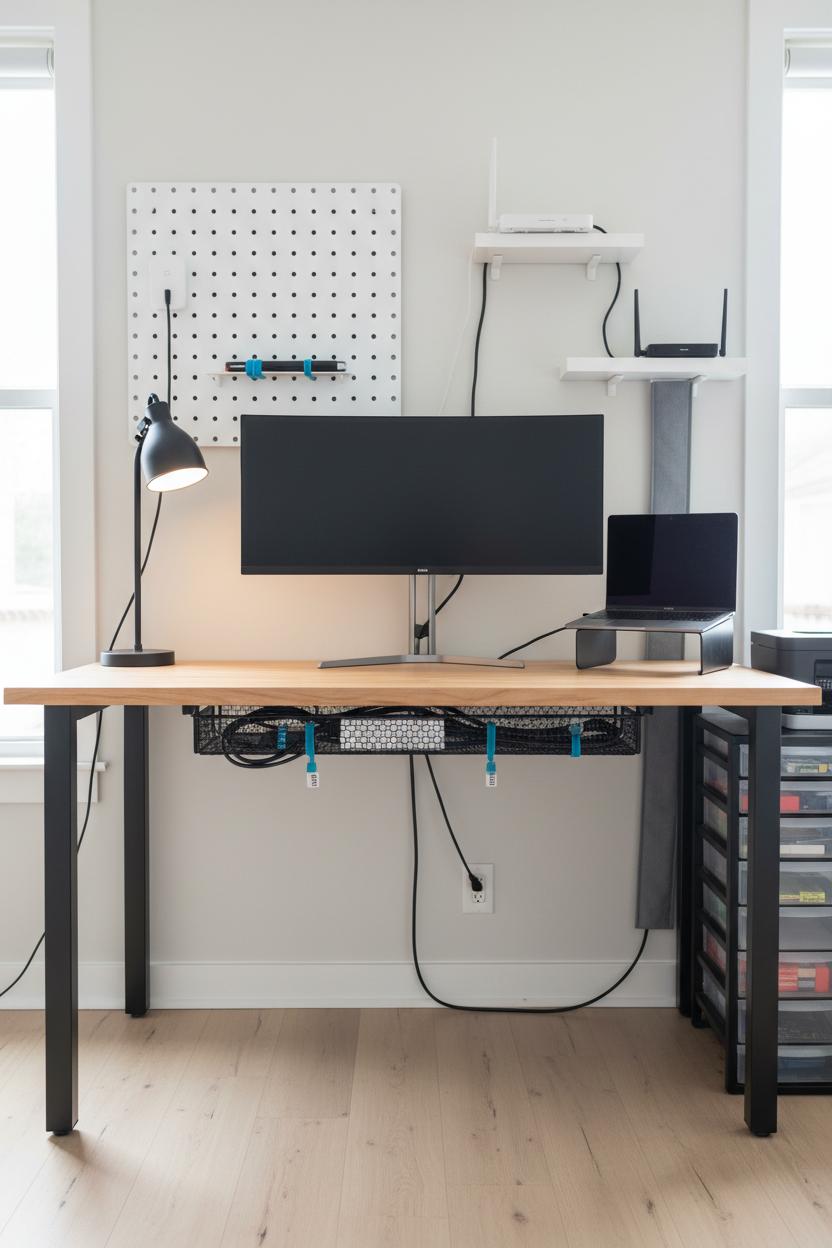 Cords used to drape off my desk like unruly ivy, tangling around chair legs and collecting dust bunnies, and honestly it ruined every “after” photo of this desk makeover. The fix that finally stuck was installing a cable management tray under the desktop—nothing fancy, just a low-profile metal basket that became mission control for every plug and power brick. I mounted the tray a couple inches back from the edge so it disappears from sight, then tucked a slim surge protector right into it. From there, each cable got a purpose: I bundled twins with soft Velcro ties, labeled the ends (phone, camera, monitor), and ran them along the underside with adhesive clips so they travel in clean, vertical lines. The trick is to create one neat “drop zone” right where the devices sit—monitor and laptop cords go straight up, while the printer’s line follows the back leg. The result is a calm horizon: legs clear, floor clear, visual clutter gone.