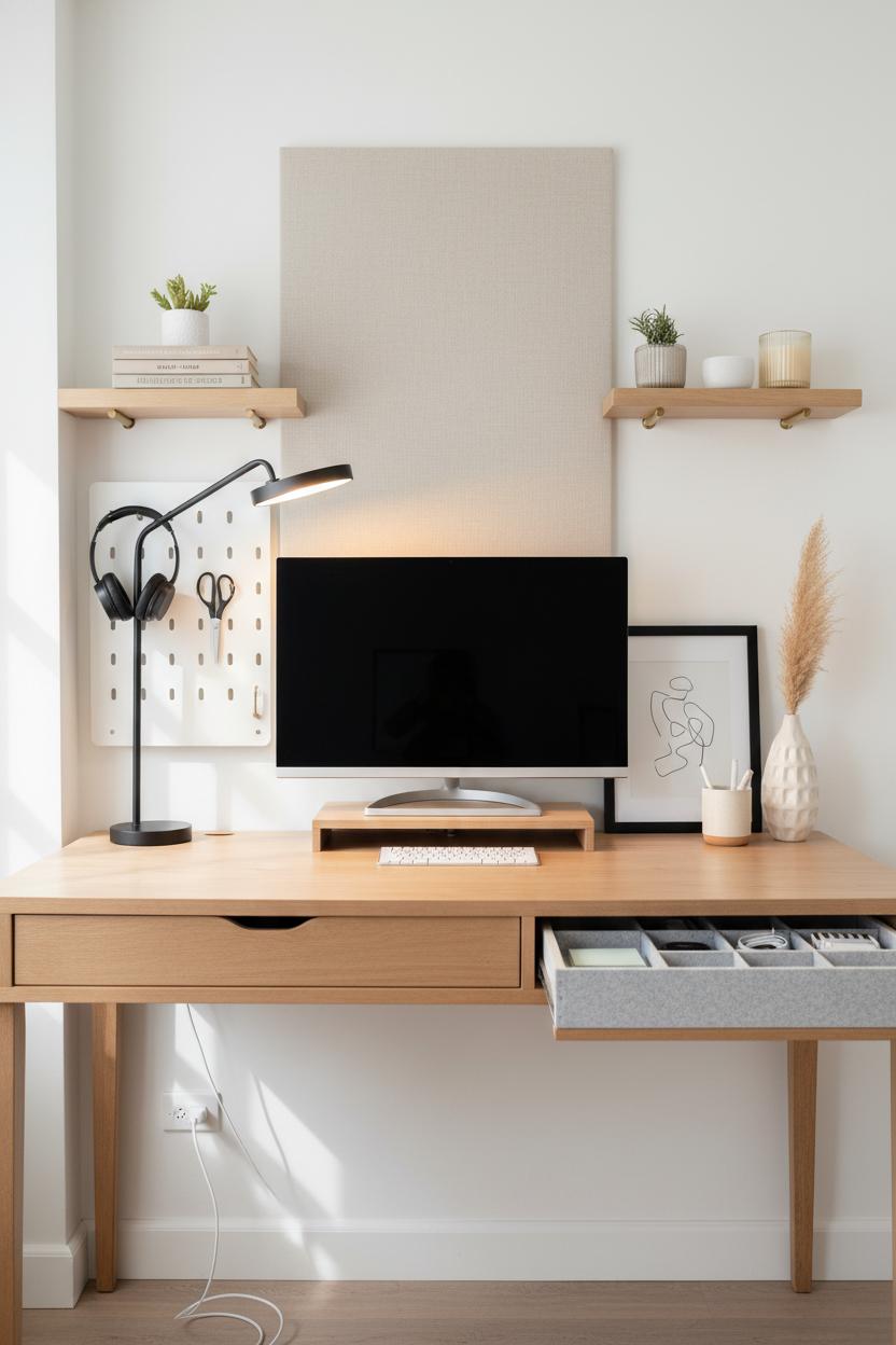 And then the after happened, and it’s the kind of glow-up that makes you want to sit down and send emails just for the vibes. The small space desk now feels twice as big without moving a wall—light wood tones, a clean white backdrop, and a soft, linen pinboard to warm it up. We swapped bulky storage for an airy mix of floating shelves and a slim pegboard organizer so the essentials float rather than crowd. Books stack horizontally as little pedestals for tiny plants, headphones hang on a brass hook, and a ceramic cup corrals pens without stealing surface area. The whole desk makeover leans minimalist but still cozy: a textured vase, ribbed glass candle, and a grounded black frame keep it from going too sweet.
