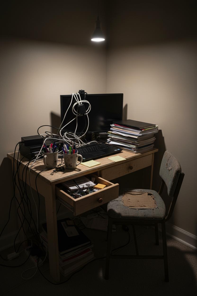 Before the glow-up, this corner was all heart, no plan. The “office” lived in a 48-inch nook with a small space desk that looked cute in photos but collapsed under real life: a thrifted top, a wobbly chair, a single shallow drawer that had become the Bermuda Triangle of paper clips. Mugs doubled as pen cups, notebooks stacked like Jenga, and cords spilled everywhere—phone charger, laptop brick, camera cable—tangling into a little knot of stress by mid-morning. The overhead light was harsh and moody at the same time, which is a magic trick but not ideal for Zoom calls; there was no task lighting to speak of, and the wall behind the monitor felt flat and unfinished. As much as I love a “collected” look, this pre–desk makeover scene read more “collected over the surface” than curated, and every work session began with a clean-up instead of momentum.
