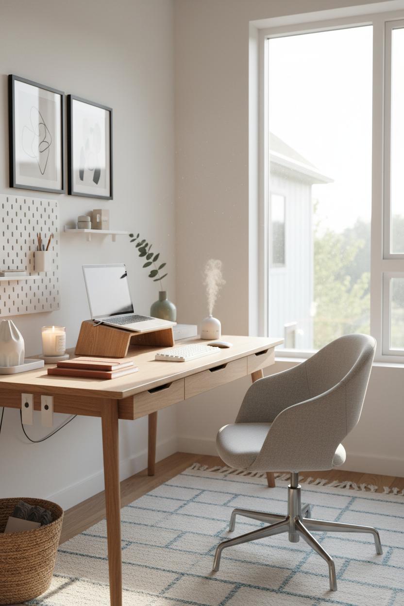 Now, tie style to function with a thoughtful desk setup that supports the way you work. An ergonomic office chair gives you posture-friendly comfort, while a standing desk or a height-adjustable converter helps you switch up your energy when the afternoon slump hits. A slim laptop stand brings your screen to eye level and frees up precious surface area, and a minimalist desk organizer corrals pens, notebooks, and cables so your tools feel curated, not chaotic. Speaking of cables, simple cord management—cloth sleeves, adhesive clips, even a wooden cable box—instantly tidies the view and keeps the aesthetic clean. If you’re curating workspace ideas, remember the sensory details: a diffuser with a bright citrus blend for focus, a playlist that hums in the background, a ceramic mug that feels good in your hand. Add a small tray for daily essentials, a framed quote you love, and one statement object (a sculptural vase, a stone bookend) to anchor the scene. The result is a space that looks pulled together, works beautifully, and quietly nudges you to sit down, breathe, and make something you’re proud of.