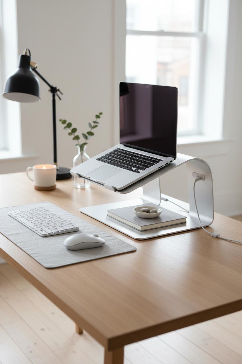 A good laptop stand is the quiet hero of a creative workspace: it lifts your screen, opens up precious surface area, and instantly makes your desk setup look intentional. Think of it as jewelry for your laptop that also saves your neck and shoulders. Aim to raise the top third of your screen to eye level so your chin isn’t tilting down all day; pair it with an external keyboard and mouse to keep your wrists neutral and your shoulders relaxed. Adjustable stands with a gentle tilt help reduce glare and keep airflow moving, so your computer runs cooler and your ideas run longer. I love options that nod to Scandinavian design—sleek aluminum, matte black steel, or pale birch finishes that melt into your home office decor instead of shouting over it. If you’re tight on space, a slim, arched laptop stand doubles as a mini shelf, letting you slide a notebook or a petite desk organizer underneath for that blissful, everything-has-a-spot moment.