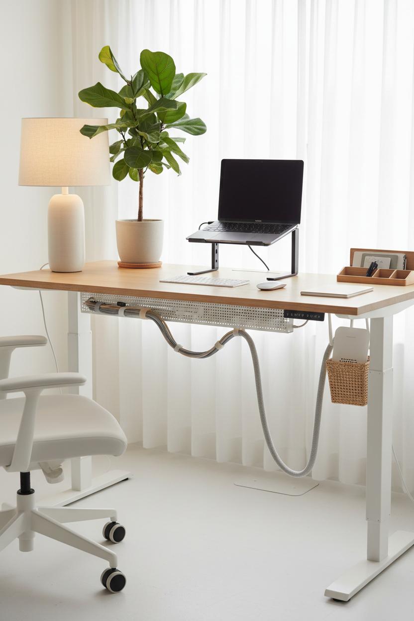 Cords have a sneaky way of stealing the calm from even the prettiest desk setup, but a little intention can turn that tangle into a clean, minimal moment that feels distinctly Scandinavian. Start by imagining the flow of your creative workspace: where your laptop rests on a slim laptop stand, where lamps cast a warm glow, where your favorite plant reaches for the light. Then give every cable a path. A desk with built-in grommets is ideal, but adhesive grommets or a slim cable pass-through work just as well. Mount a narrow cable tray or raceway under the desktop to gather power strips out of sight, and use soft Velcro ties to create tidy bundles in neutral tones that blend with your home office decor. Label the ends you unplug often, and keep only the cables you actually use—everything else lives in a cord management box for a look that’s airy and intentional.