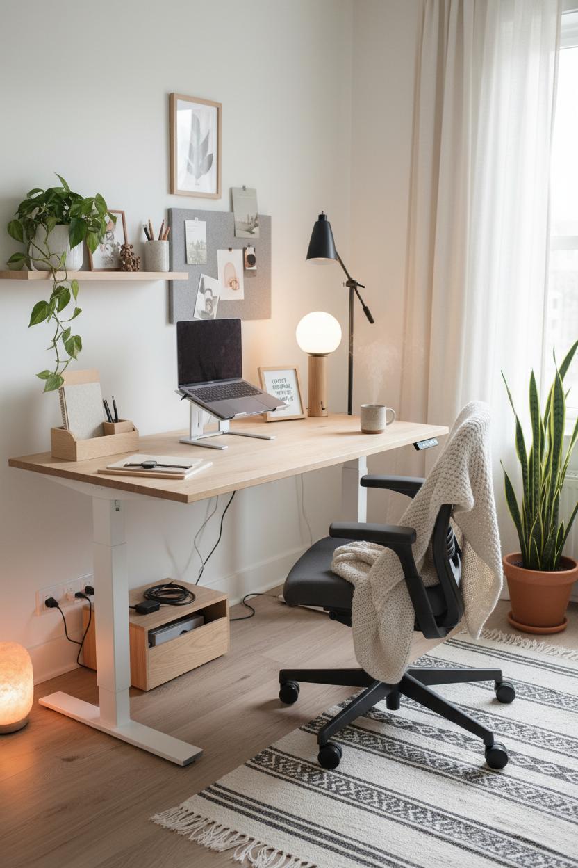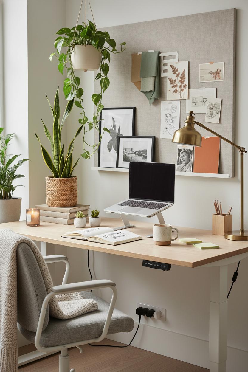 Start by mapping how you move through your day, then let your desk setup follow. If you’re a morning person, angle your desk toward a window so natural light pours across your keyboard, and keep a quiet corner for afternoon deep work with a soft task lamp. A slim standing desk can be a game-changer in a creative workspace, letting you shift posture and energy on the fly; pair it with an ergonomic office chair so your back feels as supported as your ideas. Elevate your screen on a laptop stand to keep your gaze neutral, and tuck an external keyboard beneath when you need the surface clear for sketching. These simple workspace ideas instantly look polished and feel effortless, setting the tone for productivity without sacrificing personality.