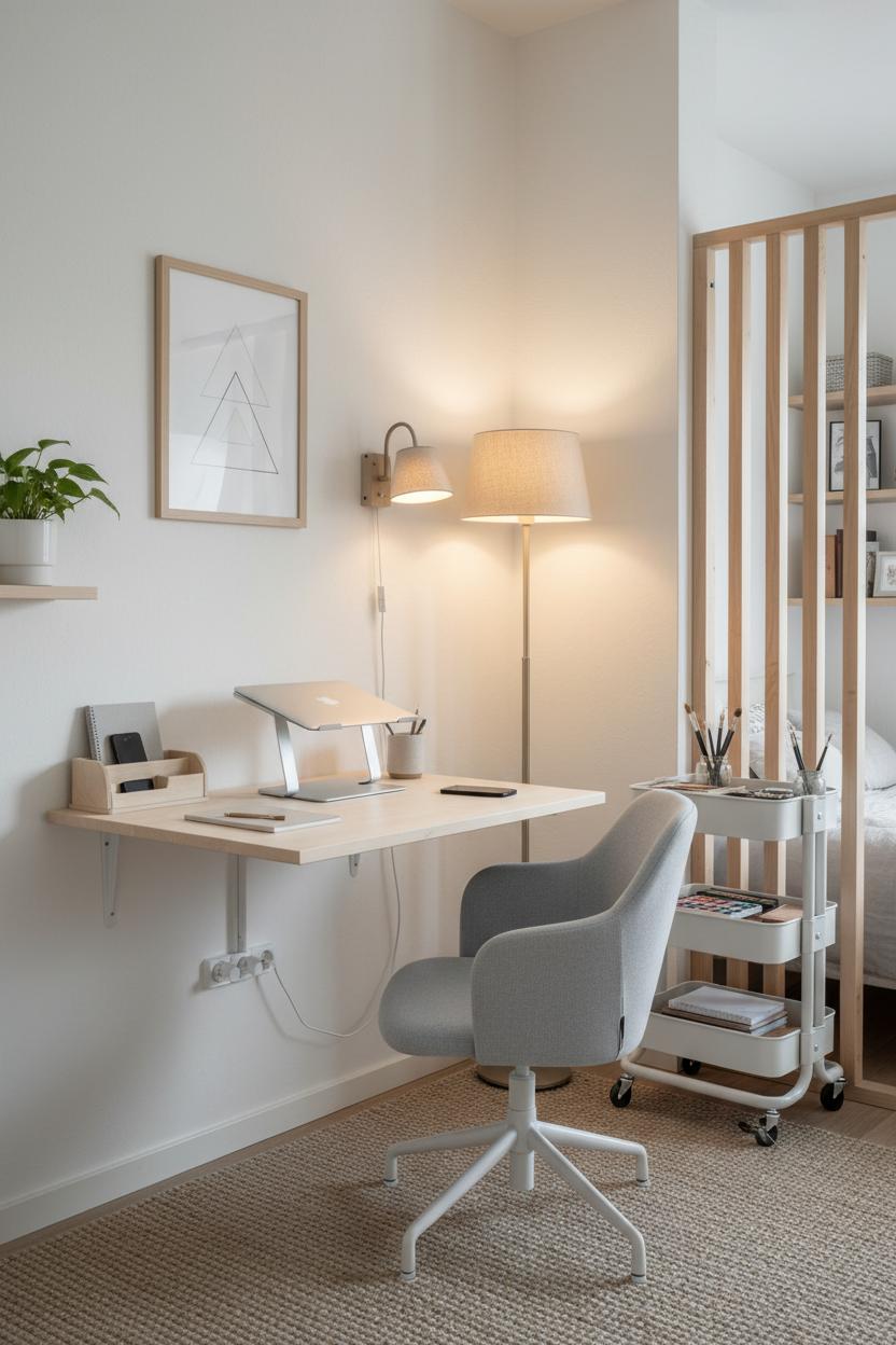 For roommates or multipurpose rooms, think in layers and zones. A lightweight screen or open shelving can act as a movable boundary, signaling “focus mode” while storing supplies. Use nesting boxes for projects-in-progress so you can clear the surface in seconds. When space is truly minimal, a foldable wall desk paired with a laptop stand and strict cord management keeps things crisp and portable. These small-space workspace ideas make it effortless to transition from living to working without sacrificing style, so your nook feels intentional, inspiring, and ready whenever creativity calls.