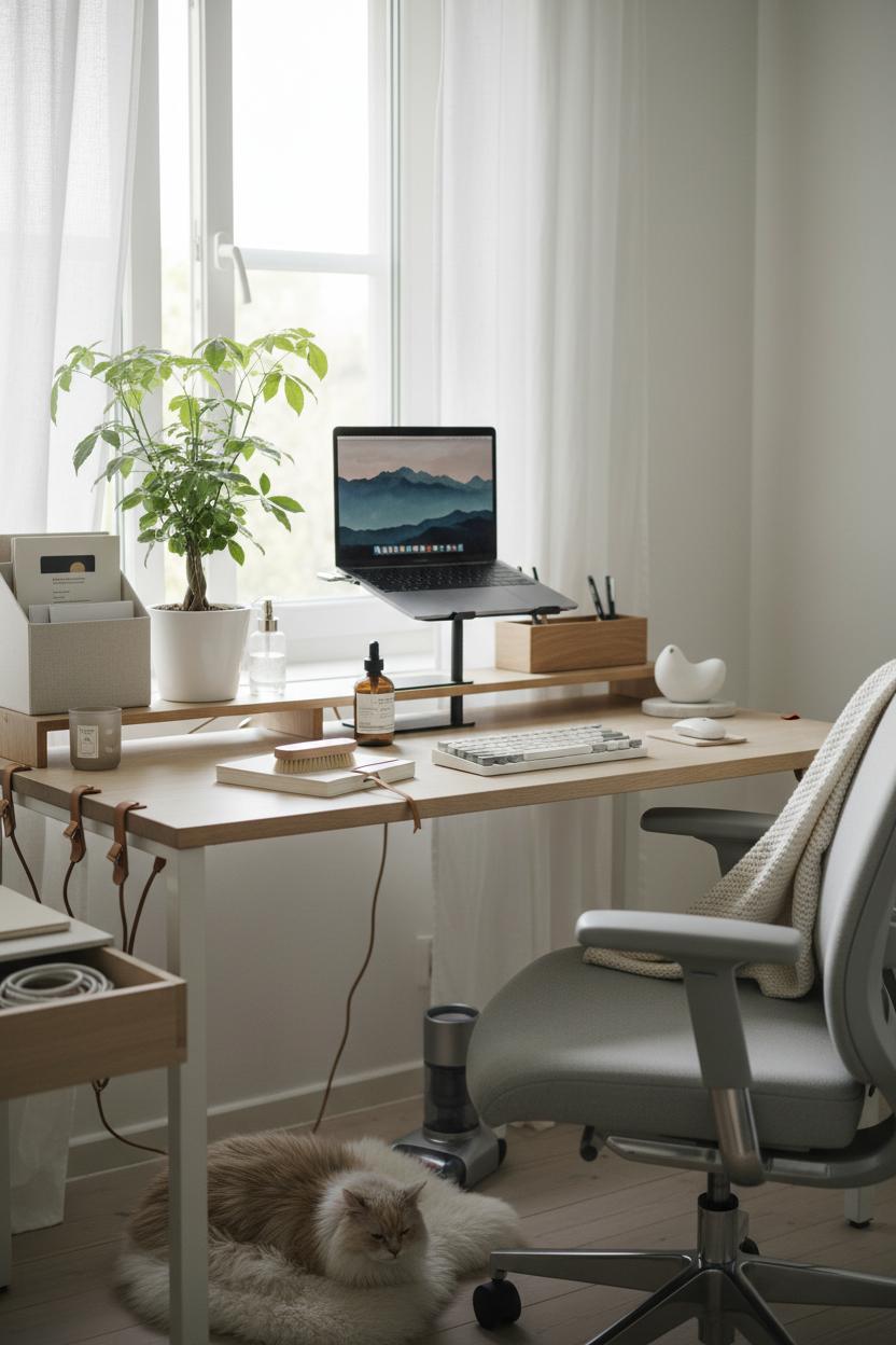 Think of maintenance as a little love letter to your space—gentle, regular rituals that keep your desk setup feeling fresh, functional, and quietly chic. Start with a daily two-minute tidy: clear cups, put pens back in a pretty desk organizer, wipe the surface, and straighten your laptop stand so those clean lines read intentional. Once a week, do a deeper reset inspired by Scandinavian design: open a window, dust every surface (especially under a standing desk), mist the leaves of your plant, and corral stray cables with simple cord management clips or sleeves so your visual field stays calm. Keep a small curation of essentials only—one beautiful notebook, your favorite pen, a coaster, and a single object that sparks joy—then tuck everything else out of sight.