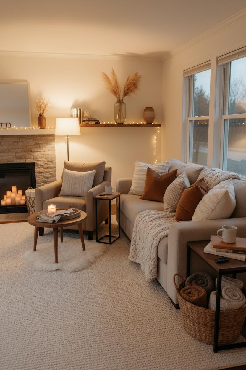 When the air turns crisp and twilight lingers, think of your fall living room as a cocoon waiting to wrap you up. Start with touchable layers: drape a chunky knit blanket across the sofa, then pile on neutral throw pillows in boucle, linen, and velvety textures for that instantly cozy aesthetic. Keep the palette calm and creamy so it flows with a neutral home—tones of oat, caramel, and mushroom gray feel particularly soothing once the sun dips. Bring in natural moments to soften the room’s lines: a tall vase of pampas grass decor, a woven basket for extra throws, a wooden tray to corral mugs and remotes. Lighting is the heartbeat of hygge decor, so trade harsh overheads for a warm glow—thread warm string lights along a shelf or window, cluster flameless candles on the mantel, and let a shaded floor lamp pool light in the corner where you love to unwind. Layer a plush rug (even a small faux sheepskin) underfoot, cue a mellow playlist, and let the room exhale.