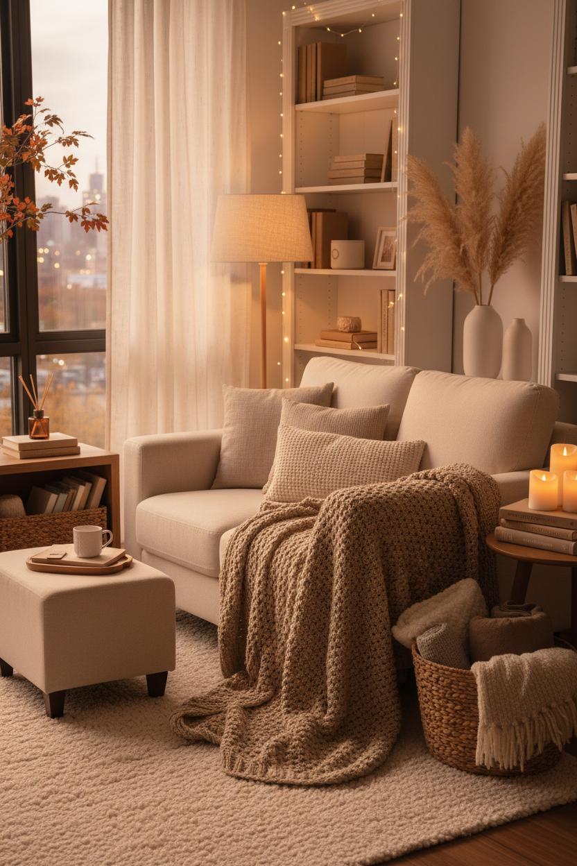When you’re working with an apartment or studio, a reading escape doesn’t need its own room—just a thoughtfully styled corner that feels like it’s hugging you back. Start by claiming a sliver of space near a window, the end of a sofa, or even the blank wall behind a door, and anchor it with a compact armchair or a plush floor cushion and pouf. Keep the palette soft to blend with a neutral home while still leaning into that cozy aesthetic we crave on crisp evenings: think oatmeal, mushroom, and caramel tones that pair beautifully with the rest of your fall living room. A slim side table or stacking stools hold your book and tea without eating floor space, and a woven basket tucked underneath corrals current reads and a spare throw.