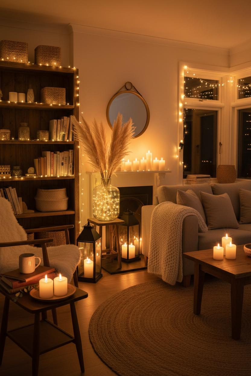A simple styling tip: mix light sources like you mix textures. Pair the twinkle of warm string lights with the steady flicker of candles, then dim overheads to let the glows do the talking. Conceal battery packs with a stack of books or a ceramic bowl; use clear hooks to float lights without visual clutter. Even a single garland of lights threaded across a window and three flameless candles on the coffee table can transform the mood from everyday to cozy aesthetic. It’s effortless magic—tiny lights, big comfort—that turns the season’s early nights into an invitation to linger.