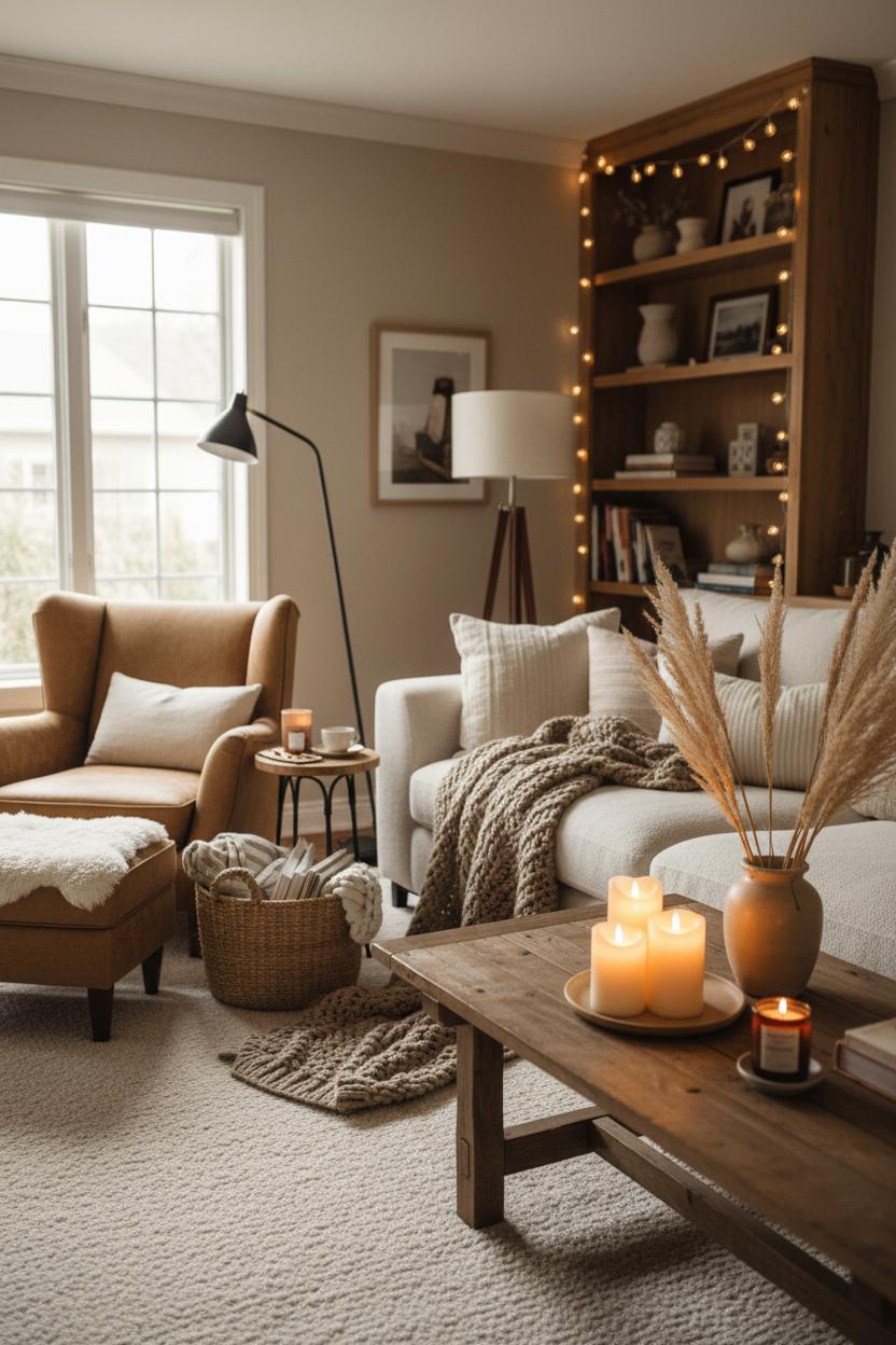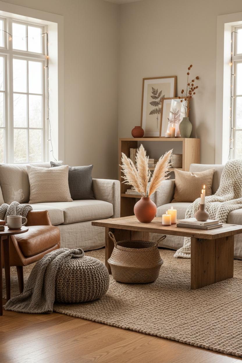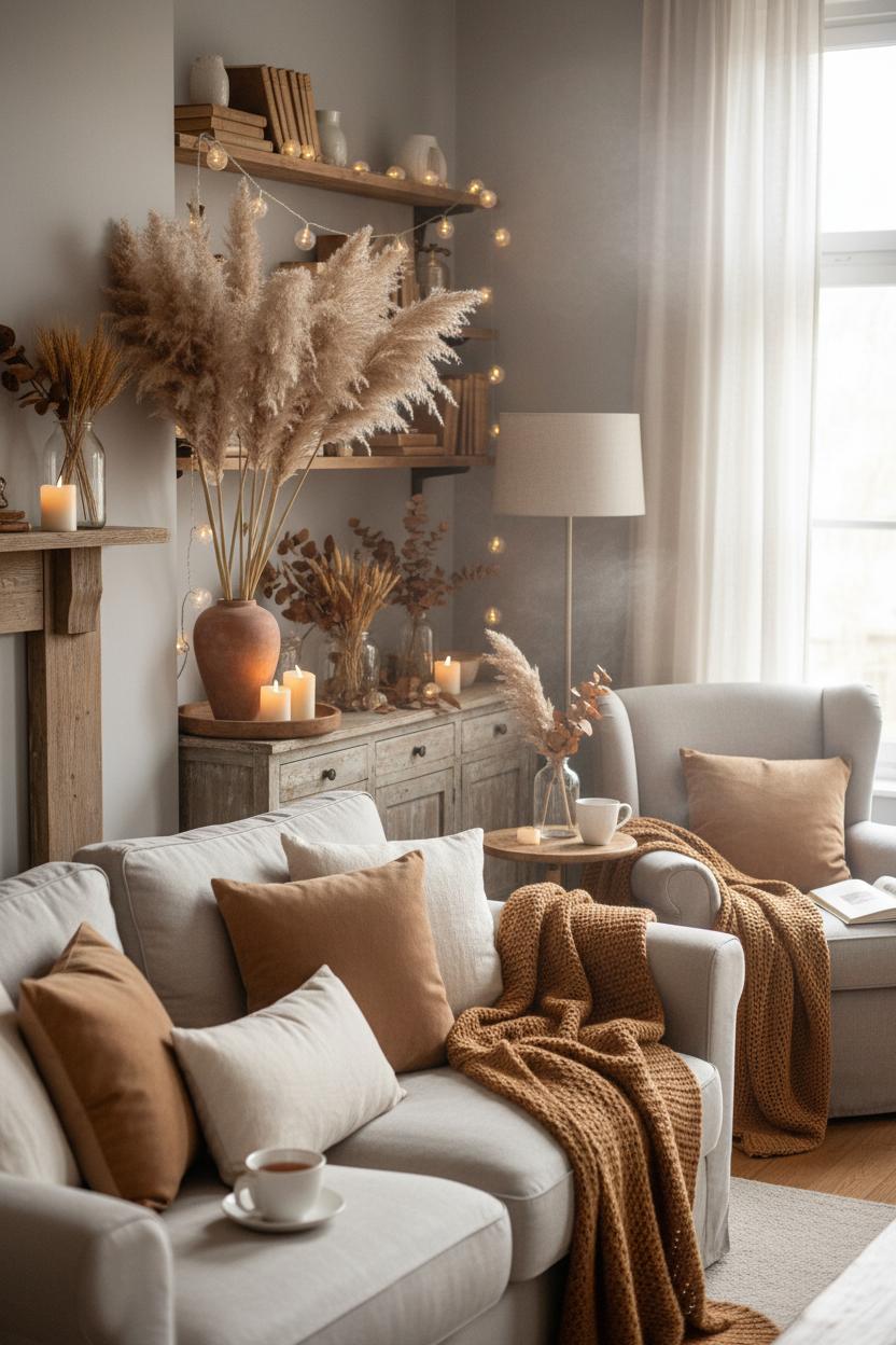A cozy aesthetic starts with mood, and mood begins with light and texture. Think of your fall living room as a soft landing place at the end of the day: dimmed lamps, warm string lights draped along a bookshelf, and a trio of flameless candles on the coffee table casting that flickering, golden hush. Keep the palette grounded in a neutral home scheme—creams, camel, mushroom, and warm grays—then build depth with layers you can actually sink into. Swap in neutral throw pillows with nubby weaves, a plush area rug underfoot, and a chunky knit blanket tossed casually over the arm of the sofa. A simple vase of pampas grass decor adds feathery height and movement without competing with the calm. The result is that effortless blend of comfort and calm that whispers hygge decor without trying too hard.