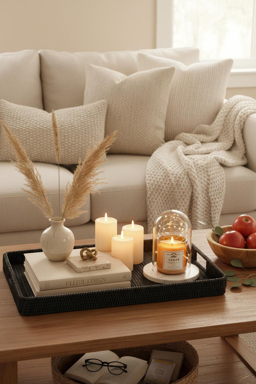 Think of your coffee table as the stage where your cozy aesthetic takes the spotlight, inviting everyone to slow down and settle in. Start with a simple foundation: a low-profile tray in woven rattan or matte black to corral your essentials and keep the look intentional. Layer texture and height to get that effortless, lived-in feel—stack a couple of well-loved design books, then add a petite ceramic vase with pampas grass decor for soft movement and a touch of organic drama. Keep the palette gentle and grounded so it blends with a neutral home: warm wood, creamy stone coasters, and a hint of amber glass that catches the late-afternoon light and nods to a fall living room mood without shouting it.