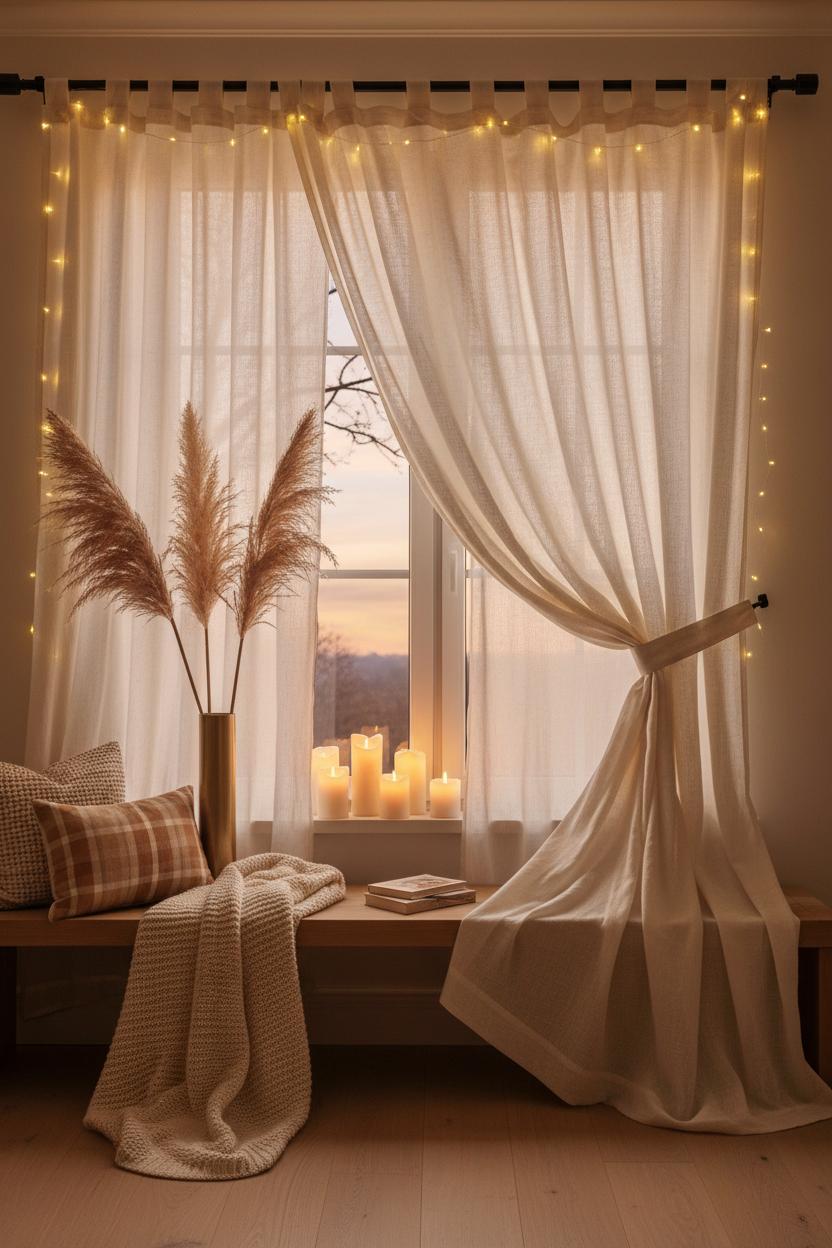 Lighting layers at the window turn glass into a glow reflector. Drape warm string lights along the rod or tuck them behind sheer panels so they twinkle through the fabric. Cluster flameless candles on the sill or a nearby console; their flicker doubles in the windowpane, creating instant ambience with zero worry. Style a slender vase of pampas grass decor beside the frame so feathery plumes catch the light and add height without clutter. If you have a ledge or bench, turn it into a tiny sanctuary: stack neutral throw pillows in varied textures and fold a chunky knit blanket at the ready—reading nook ideas don’t get simpler or more inviting. Keep colors calm and tactile, then sprinkle in a single autumnal stripe or windowpane pattern for quiet character. The goal is to guide the eye toward softness, harness the evening glow, and invite lingering. With the right layers and a few thoughtful details, your windows become the backdrop to every cozy moment this season.