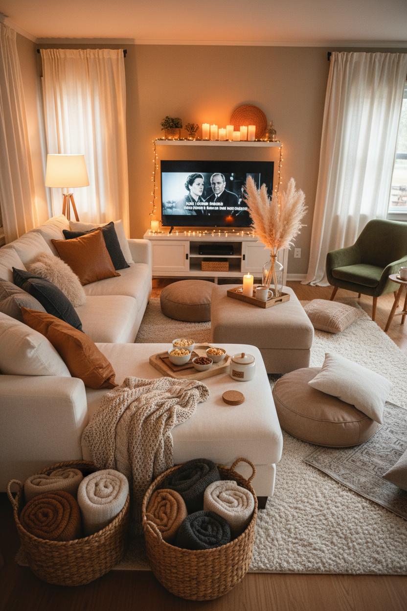 There’s something magical about pressing play on a favorite film when the air turns crisp and the house glows softly. For a movie night that leans fully into a cozy aesthetic, start by building a plush landing zone in your fall living room. Think layered seating: a cushy sectional or loveseat anchored by a thick rug, then add floor poufs, an oversized ottoman, and a scatter of neutral throw pillows you can sink into. Drape a chunky knit blanket over the arm for instant texture and warmth, and keep a woven basket nearby with extras for guests. If your style veers toward a neutral home palette, mix shades of cream, caramel, and warm gray with a few moody accents so the room feels calm but still autumn-rich. It’s very hygge decor—inviting, tactile, and just a touch rustic.