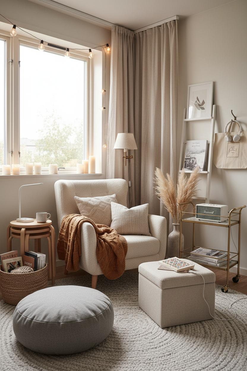 Lighting is everything in a nook this small. Drape warm string lights along a curtain rod or shelf for an instant glow, then layer in flameless candles to get that flicker without the worry. If hardwiring isn’t an option, a plug-in sconce or rechargeable lamp keeps the vibe intimate and renter-friendly. Textiles do the heavy lifting for comfort: a chunky knit blanket over the arm, a pile of neutral throw pillows for lumbar support, maybe a sherpa cushion for extra coziness. A lidded ottoman or storage bench multitasks as footrest, seating, and secret stash for magazines and chargers. For movable surfaces, a rolling bar cart becomes a petite library on wheels—top shelf for your mug, lower shelves for books and a tiny speaker for soft jazz or rain sounds.