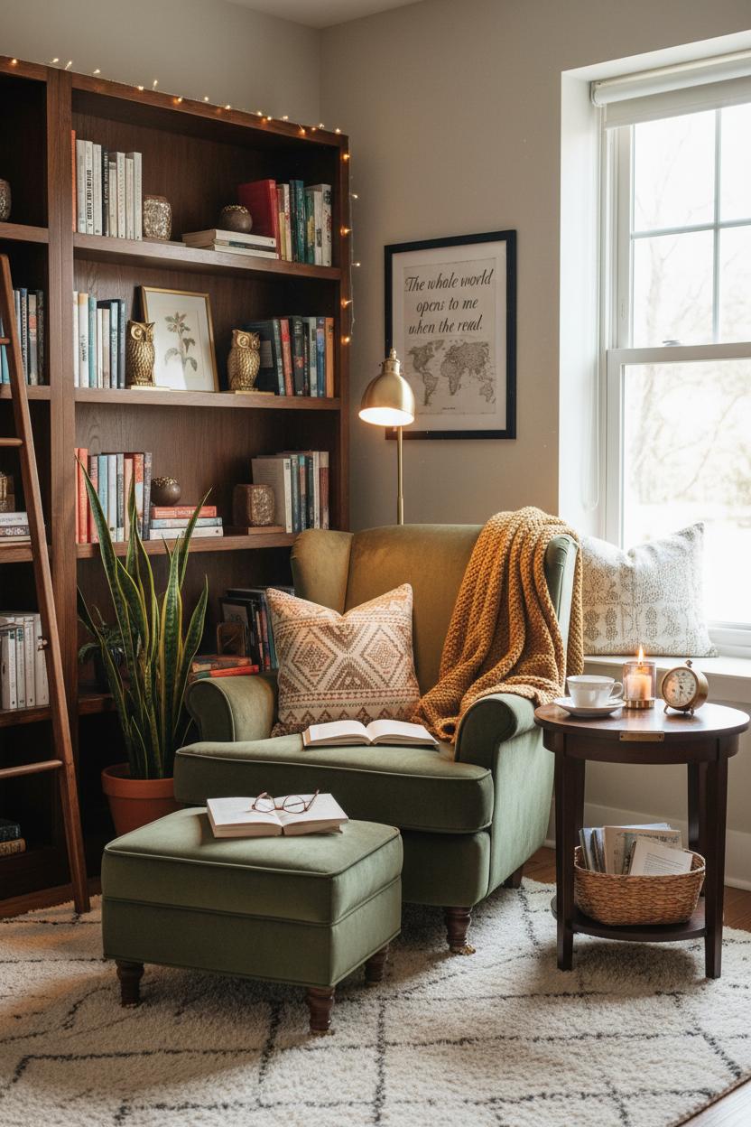 Light is the soul of reading nook decor, so treat it like jewelry—layered and flattering. Let daylight wash in during the morning, then rely on a dedicated reading lamp at dusk; place it just behind or beside your shoulder to cast a pool of warm light over the page. Choose a bulb on the warm side so the scene glows rather than glares, and add a strand of fairy lights or a candle for that gentle, starry hush. Comfort is the final spell: a plush throw blanket to tuck around your legs, a couple of overstuffed pillows, and a teacup and saucer that makes your nightly chapter feel ceremonial. Sprinkle in bookish room ideas that tell your story—a framed quote above the chair, a tiny clock, a vintage map, or a petite ladder leaning by the shelves. As the scene comes together, notice how the textures, the lamp glow, and that patiently waiting stack of novels turn the nook into a daily invitation. When layout guides your eye, light sets the mood, and comfort keeps you lingering, the whole corner becomes a soft whisper to sit, breathe, and read.