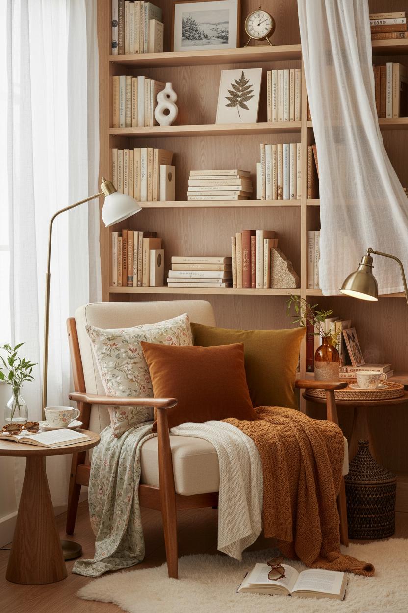 Windows make the dreamiest bookish room ideas. Even a shallow sill can transform into a perch with a layered cushion and sunlight pooling over your pages. Dress the glass with airy café curtains, then nestle a small wooden side table beside the frame for your mug, a bud vase, or that teacup and saucer you swear makes tea taste better. A throw blanket draped over the back of a chair softens the edges, and a petite cozy bookshelf tucked just under the window keeps your current reads close. The result is a lived-in glow—reading nook decor that feels warm, personal, and perfectly sized for small-space magic.