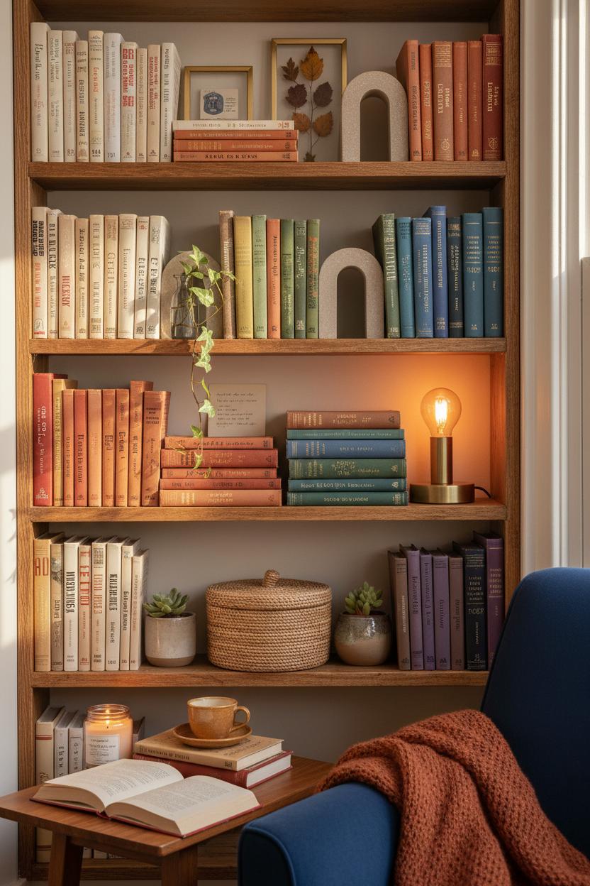 Personal details are what turn reading nook decor into a lived-in haven. Slip a handwritten note between volumes, pin a museum ticket in a frame, or rest a well-loved teacup and saucer on a shallow stack of poetry so the whole scene invites slow sips between chapters. Keep a wooden side table nearby for your current read and a candle; drape a nubby throw blanket over the chair so the textures echo what’s happening on the shelves. Choose a palette that reflects your mood: rust, olive, and oat for earthy calm, or deep sapphire and plum for a moody library cocoon, then echo those hues in your art, plant pots, and even your book jackets. Swap a few pieces with the seasons—pressed leaves in fall, light florals in spring—for easy, bookish room ideas that feel fresh without a major overhaul. Most of all, let your cozy bookshelf tell your story: display the dog-eared paperbacks you actually reread, showcase travel finds alongside favorite authors, and layer it all with warm light and texture so every glance feels like an invitation to linger.