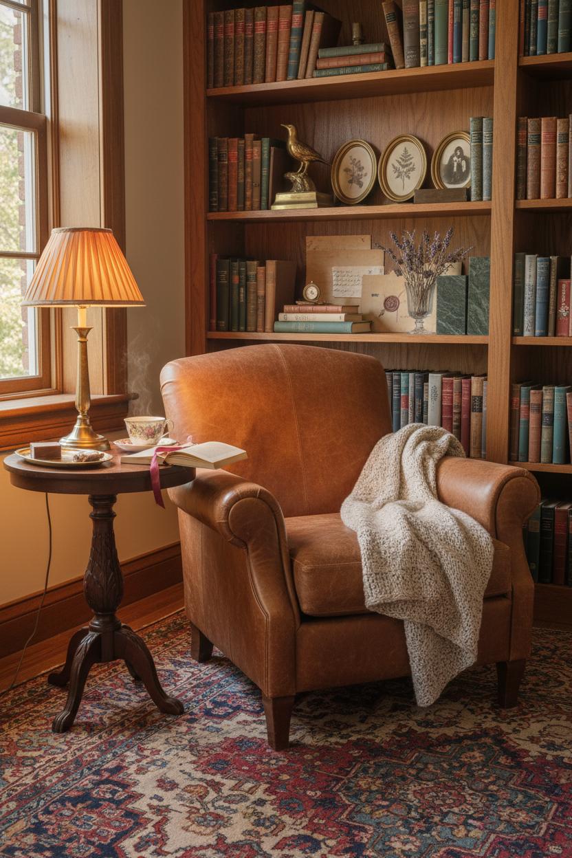 When styling a cozy bookshelf, mix leather-bound editions with cloth covers and a few modern paperbacks for balance, then use weighty bookends—brass birds, marble blocks, even carved wood—to corral your favorites without looking rigid. One of my favorite bookish room ideas is to tuck a tiny still-life on a shelf: a small vase with dried flowers, a pocket watch, and a postcard layered against the books. Drape a nubby throw blanket over the arm of your chair so it’s within easy reach when the plot thickens, and keep a slim tray for matches if you like a candle’s glow after dusk. Let objects patinate naturally: a bit of ring on a tabletop, softened leather, a scuff on the floor—these marks are memory. Keep surfaces simple so the eye can rest: a wooden side table for your mug, the reading lamp, and a single bloom is all you need. With time, your corner will feel less styled and more soulful, the kind of vintage library style nook that invites you to linger for “just one more chapter.”