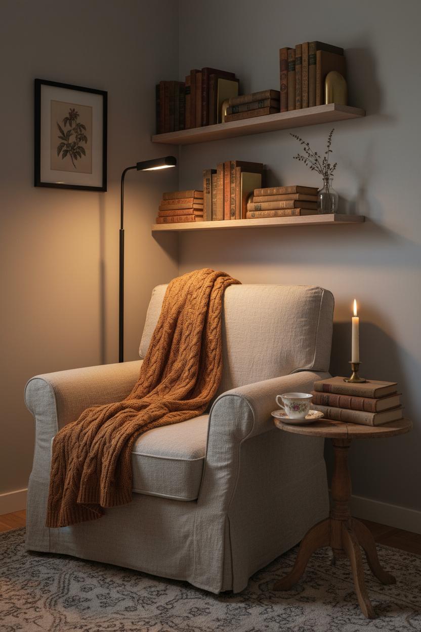 When space is tight, think in terms of whispers rather than shouts: corners, alcoves, and windows become small sanctuaries that tell a whole story. Start with a forgotten corner and layer it slowly—an armless chair or plush floor cushion, a wooden side table just big enough for a stack of paperbacks and a teacup and saucer, and a soft throw blanket that looks like it’s always been waiting for you. Bring in a slim reading lamp to anchor the spot and cast that golden glow the books aesthetic is famous for. Mount a narrow ledge or floating shelves above to create a cozy bookshelf moment; a pair of sculptural bookends turns even a handful of titles into décor. For reading nook decor that feels collected, tuck in a small framed print, a taper candle, and maybe a tiny vase of foraged branches—the kind of quiet details that make the corner feel like a whispered secret.