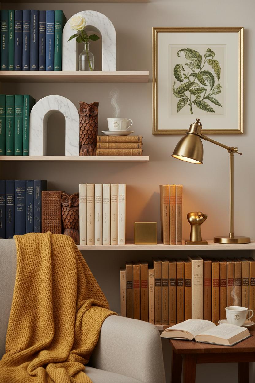 Form still follows function, though, so choose sturdy pairs that won’t budge. Heavier materials with felt or rubber bottoms keep tall hardbacks upright, while discreet L-shaped or acrylic bookends practically disappear when you want the titles to shine. For effortless reading nook decor, echo your bookend finishes with nearby accents: a brass reading lamp for warm, flattering light; a textured throw blanket casually draped over the chair; a wooden side table that holds your current read and a steaming mug. Consider color flow too—pull tones from your covers into the stone veining or metal finish of your bookends, and repeat that hue once more in a pillow or framed print. Little styling rhythms like stacking two horizontals beneath a vertical run, or grouping in odd numbers, give that editorial polish without feeling fussy. If you’re craving bookish room ideas, start by dedicating one shelf to a mood—mossy greens and botanical prints, inky blues and poetry, parchment neutrals and history—and let the bookends set the tone for each chapter. It’s an easy, tactile way to make your cozy bookshelf feel personal, photogenic, and irresistibly settle-in-with-a-chapter inviting.