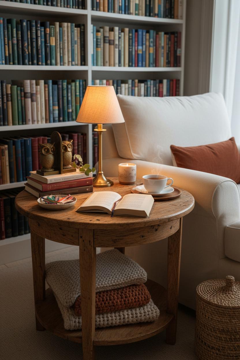 Styling the surface is where reading nook decor comes alive. Start with warm light: a petite reading lamp that casts a soft pool over the page. Layer in a small tray so a teacup and saucer doesn’t wander, and tuck a pair of bookends to corral your current reads like tiny sculptures. A candle and a sprig of eucalyptus add atmosphere without clutter, while a ceramic dish catches bookmarks and matches. If your wooden side table has a lower shelf, roll a throw blanket and stash it underneath for easy reach; if not, slip a lidded basket beside it for the same effect. These bookish room ideas don’t have to be fussy—let the tones echo your shelves and chair, and let the patina build with time. The table’s job is to invite you to linger, to make room for the little luxuries that elevate a moment: the warm mug ring, the glint of brass, the paperback paused mid-chapter. When the essentials are within arm’s reach and the materials play nicely with your cozy bookshelf, your corner feels collected, personal, and ready for long, quiet hours—a tiny sanctuary that proves the simplest piece can complete the whole space.