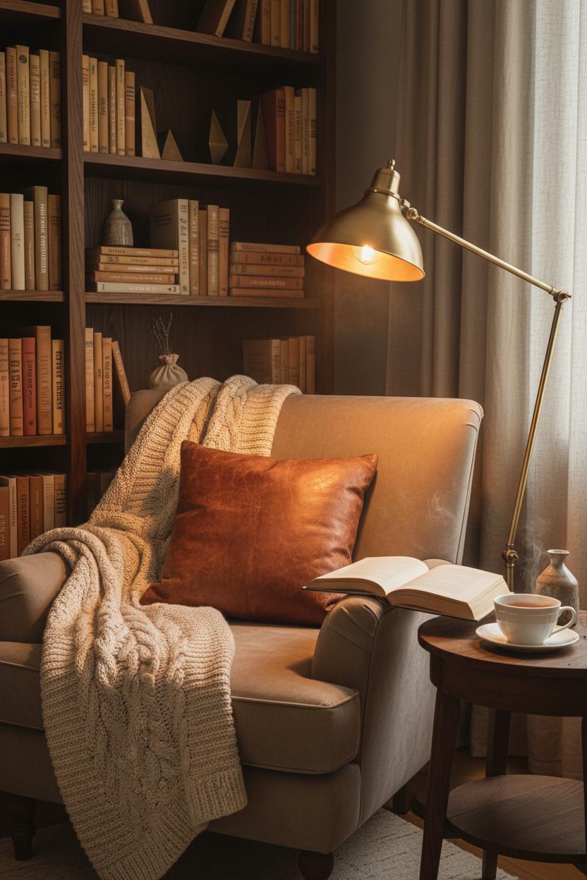 When the air turns crisp, gently dial up the drama. Autumn loves russet, olive, and caramel; velvety cushions and a plush throw blanket invite marathon chapters. Bring in textured pottery, amber glass, and darker wood bookends to inch toward a vintage library style without going full moody. In winter, double down: a heavier knit, brass accents, and the quiet tick of a mantle clock turn the nook into a cocoon. Let your reading lamp cast a golden pool over well-loved pages, keep a teacup and saucer steaming with chai, and lay a sheepskin underfoot. Rotate framed art for seasonal color, stash off-season textiles in a lidded basket, and let your reading nook decor evolve with your routine. It’s a gentle rhythm that keeps comfort high and your books aesthetic endlessly inspiring.
