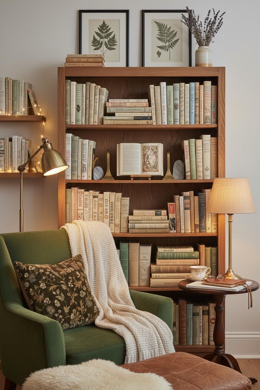 For bookish room ideas that feel personal, style stacks by mood as much as by color: poetry and journals within reach, big history tomes lower down, favorite novels front and center so their patina can shine. Slip handwritten notes or travel postcards between the pages of the books you display, and let a few open spreads showcase beautiful endpapers or illustrations. Combine framed botanical prints with a petite vase of dried stems to echo the paper textures on your shelf. If your space is tight, a slim wooden side table keeps essentials close without clutter; pair it with soft bookends on a wall-mounted ledge to save floor space. A task-style reading lamp adds focus, while a secondary glow—string lights or a shaded sconce—keeps the ambiance tender. Finish with a plush throw blanket at the ready and a teacup and saucer that feels like your signature ritual. The goal is less perfection, more story: a lived-in, layered harmony where every object earns its place and your books whisper you home.