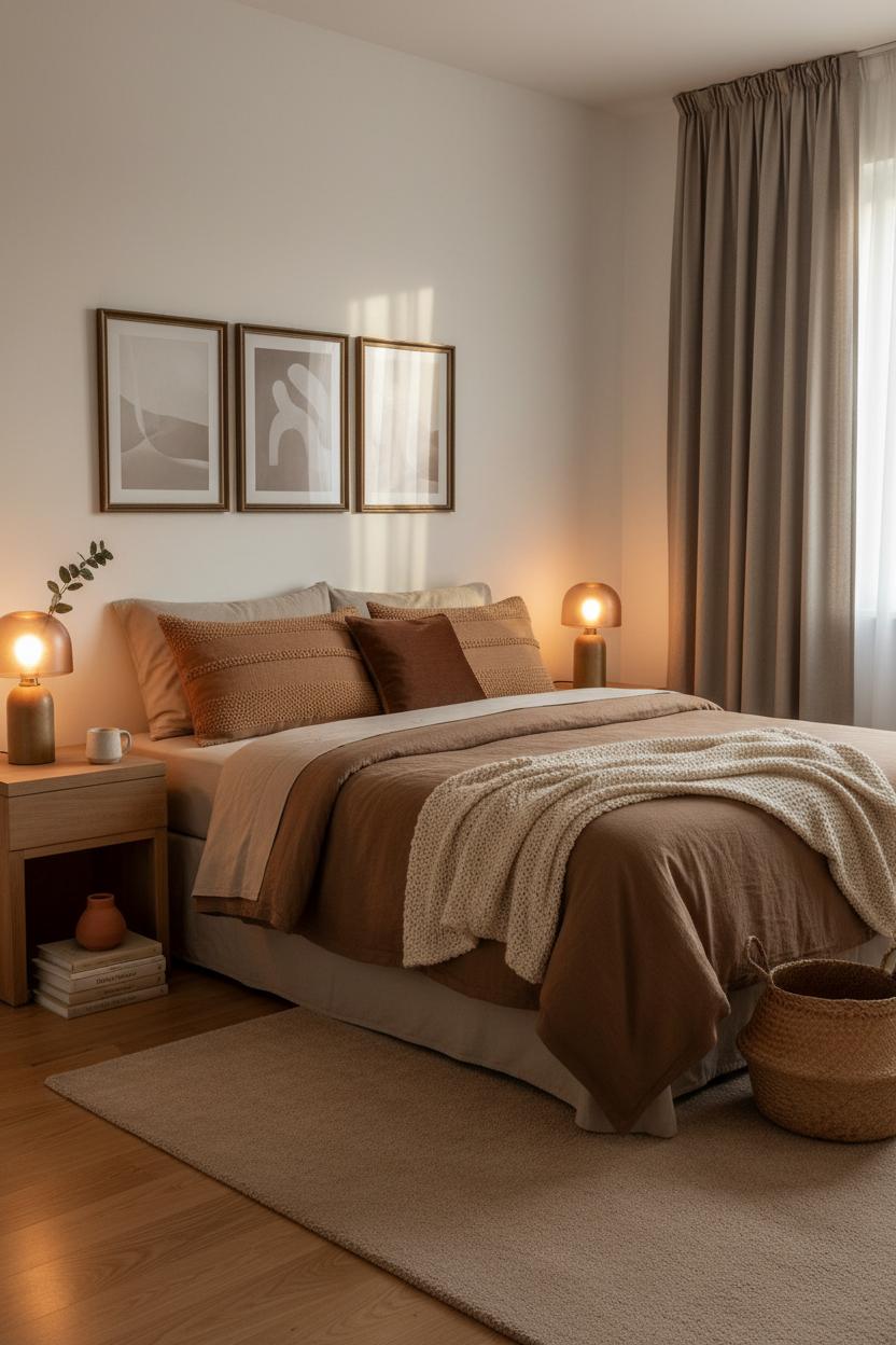 Think of caramels, taupes, and mocha as the soft-spoken trio that instantly warms a room without shouting for attention. Start with your anchor: a mocha linen duvet that sets the tone with rich, cocoa depth, then layer in lighter taupe sheets and caramel lumbar pillows so the bed feels like a latte poured with perfect foam art. This is the heartbeat of the brown aesthetic—quietly luxurious, grounded, and endlessly calming. Let the palette trickle outward: a plush rug in sandy taupe, a clay-colored vase on a wooden nightstand, and a creamy throw to soften every edge. The magic is in the mix of shades and finishes, letting the earthy tones do the heavy lifting while everything else whispers.