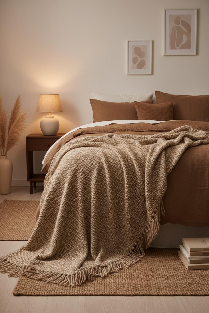When you’re curating a minimalist boho look, the right textured throw blanket is the finishing touch that makes the whole scene feel intentional and inviting. Think of it as the soft punctuation at the end of your bed story—something you can drape loosely over a mocha linen duvet so the crinkles and folds catch the light in that effortlessly undone way. In a room guided by earthy tones and a warm brown aesthetic, textures are what create depth without clutter. Look for tactile weaves like chunky knits, boucle, or waffle patterns that read subtle up close and soothing from afar. A sandy beige, cocoa, or oat hue will melt into neutral home decor, but don’t be afraid of a rich caramel or espresso edge to ground the palette. The magic is in the contrast: a nubbly throw against the smooth linen, a soft fringe falling over a wooden nightstand, a cozy layer catching the glow of a warm LED lamp. It’s the kind of detail that makes even simple cozy bedroom ideas feel elevated—minimal in pattern, maximal in feel.