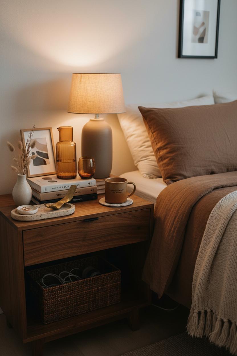 Think of your wooden nightstand as a tiny stage for your brown aesthetic to shine. The wood grain itself brings earthy tones and a grounded calm, so start with pieces that echo that warmth without cluttering the surface. A warm LED lamp becomes your cozy glow-on-demand—choose a softly curved base or fabric shade to lean into a minimalist boho mood. Then layer in an everyday stack of favorite reads, a small stoneware dish for rings, and a touch of amber glass or brass to catch the light. Keep the palette tight and soothing—caramel, mocha, oat, and soft black—so every object feels intentional and part of your neutral home decor story.