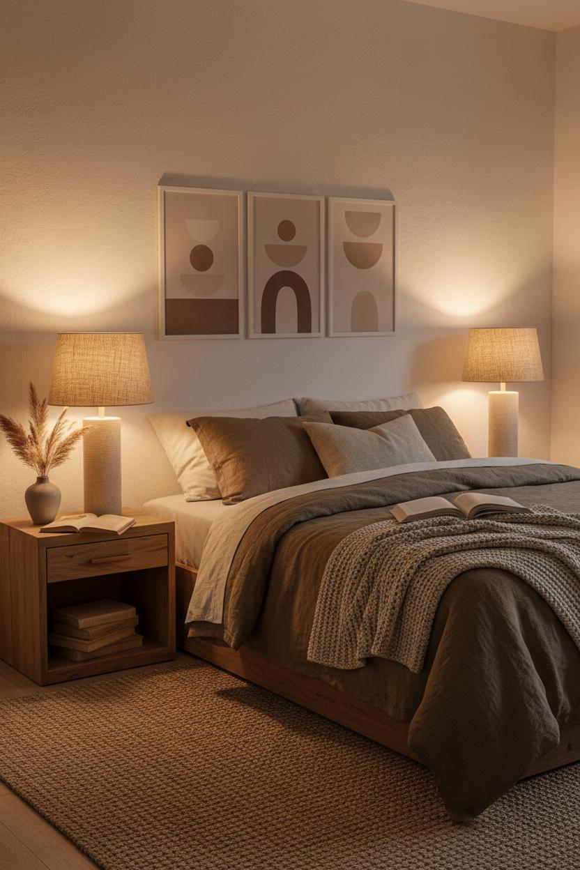 Lighting and art are your secret budget heroes. Swap harsh bulbs for a warm LED lamp and watch your neutrals glow like golden hour—this soft light flatters every surface and makes inexpensive finishes feel elevated. For the walls, go for neutral wall art that nods to nature: abstract sand-toned prints, a DIY charcoal sketch on tan paper, or a simple botanical line drawing in a thrifted frame. If you’re working with tricky layouts, anchor the bed with a natural jute or flatweave rug; in small spaces, layer two smaller rugs for the same effect without the cost of an oversized piece. Bring in life with easy greenery—dried pampas, eucalyptus, or a pothos trailing off the nightstand—and corral visual clutter using matching baskets under the bed. Keep surfaces styled but breathable: a stacked book or two, a candle in a stone holder, and that warm LED lamp create balance without overwhelming. With these cozy bedroom ideas, your neutral home decor reads calm and intentional, the earthy tones feel rich and collected, and the overall mood whispers minimalist boho—proof that thoughtful layers, not big price tags, make the biggest difference.