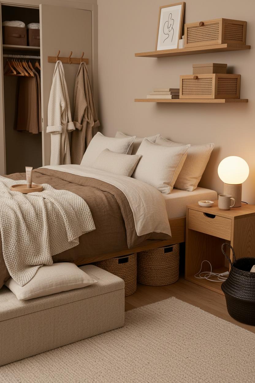 Go vertical, but keep it quiet. Floating shelves fitted with cane-front boxes corral chargers, skincare, and bedtime reads while looking sculptural, and a row of wall hooks behind the door keeps robes off-chair and out of sight. Balance function with softness by framing the vignette with neutral wall art—simple line drawings or tone-on-tone prints that echo your cozy bedroom ideas without introducing clutter. If your closet is short on space, switch to matching wood hangers and slide slim fabric bins onto the top shelf for off-season layers. A woven basket next to the bed hides cords and tech, while a petite tray on the nightstand collects hand cream and lip balm so nothing drifts. The overall effect is serene and tactile: minimal, but never cold; tidy, but still touchable.