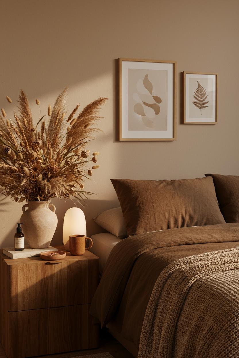 Lean into nature’s quiet drama to make the brown aesthetic feel rich and intentional. Dried florals are the easiest way to dial up earthy tones without crowding the room—think feathery pampas, wheat, and seed pods fanning out of a chunky clay vessel. The matte finish of terracotta or sand-colored ceramic adds that soft, chalky texture that reads calm instead of glossy. Set the arrangement on a wooden nightstand so the warm grain anchors all the light, whispery stems, and let a warm LED lamp glow across the petals to cast those dreamy, late-afternoon shadows. Above, hang neutral wall art in creamy taupes and soft sepias to echo the palette without shouting for attention. It’s a quietly curated, minimalist boho moment that keeps everything tonal and touchable, like a sunset captured in slow motion.