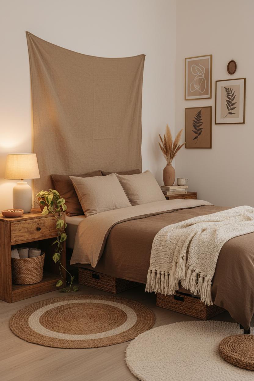 When you’re working with any room size or budget, the most affordable way to get that high-impact, brown aesthetic look is to simplify the palette and let texture do the talking. Start by choosing a few earthy tones—think latte, cocoa, sand, and clay—and repeat them in soft layers that feel collected rather than cluttered. A mocha linen duvet instantly sets a grounded mood and looks luxe even without a pile of pillows; toss on a textured throw blanket in a slightly lighter shade for subtle contrast. Keep the furniture profile clean to lean into a minimalist boho vibe, then introduce warmth through natural materials: a thrifted wooden nightstand with visible grain, a woven basket for bedside storage, a ceramic catchall for jewelry. If you crave a focal point, skip pricey headboards and stretch a neutral fabric over foam for a simple DIY, or hang a length of raw canvas as a relaxed wall drape. These small swaps keep the eye moving and make even a compact room feel designed on purpose.