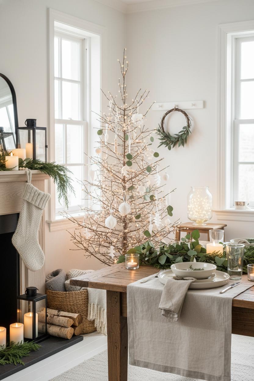 If your goal is a calm, uncluttered table that still whispers holiday magic, start with an airy eucalyptus garland as your runner. The soft, silvery green looks beautiful against natural textures and sets the tone for a neutral Christmas decor palette—think linen, warm white, and light woods. I like to lay the eucalyptus garland loosely down the center, then tuck in a few sprigs of dried baby’s breath or bleached ruscus for a cozy holiday home touch that feels collected, not fussy. Weave delicate fairy string lights through the leaves so they glow like tiny dewdrops, and anchor the scene with matte stoneware plates and simple linen napkins. The result is the kind of minimalist Christmas table that feels both effortless and welcoming, very scandi Christmas in spirit: organic, quiet, and softly lit.