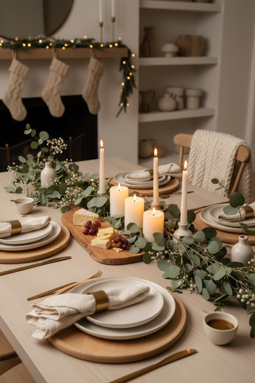 To keep the look serene during dinner, swap open flames for warm-toned flameless candles in staggered heights—pillars mixed with slender tapers—so you get that flicker without worry. Add wooden chargers or a raw-edge board under a shared cheese plate to layer in natural warmth, and let a few ceramic bud vases hold single stems of eucalyptus to echo the runner without crowding it. I love how this christmas aesthetic flows with the rest of a room: if your mantel already wears knit Christmas stockings and your shelves hold neutral Christmas decor, the table simply continues the story. Keep metals minimal—brushed brass flatware or a single vintage candlestick is enough—and let texture do the talking: the chalky finish of stoneware, the soft knit of a throw on the chair back, the feathery leaves of the garland, the gentle glow of the lights. Serve in simple bowls and decant sauces into tiny pitchers to avoid label clutter, and choose unscented candles so the food remains the star. When the dishes are cleared and the lights dim, that quiet glow along the centerline feels like a deep exhale—coziness captured in a few thoughtful layers, proof that minimalist Christmas decorating can still feel rich and full of heart.