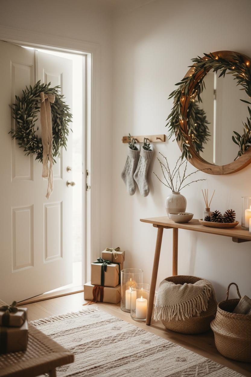 Under a bench, tuck woven baskets to corral hats and mittens while keeping the entry visually quiet. If you love a hint of tradition, hang a pair of knit christmas stockings from the peg rail in oatmeal or heather gray and slip in sprigs of eucalyptus for a modern twist. Drape a light eucalyptus garland along a mirror or shelf and weave in fairy string lights, opting for warm white to keep things soft and inviting. Hide the battery pack behind the frame and set a timer so your entry glow greets you at dusk without a second thought. A petite stack of wrapped gifts in kraft paper and velvet ribbon by the door adds that minimalist christmas charm without adding clutter.