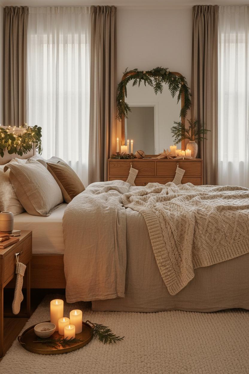 When the rest of the house is buzzing, let the bedroom become your quiet little sanctuary—soft, warm, and wrapped in neutral christmas decor that feels like a deep exhale. Start with a calm palette of oatmeal, ivory, and warm greige, then build in touchable textures: linen sheets, a chunky knit throw, and a wool rug that greets your toes in the morning. For glow that doesn’t shout, weave fairy string lights along the headboard or canopy and scatter flameless candles on the nightstand and dresser; their amber flicker instantly softens edges and sets a restful mood. A simple eucalyptus garland draped over a mirror or bedframe adds a gentle, spa-like scent and that Scandi-meets-nature vibe we love in a scandi christmas. If you’re feeling a little playful, hang petite knit christmas stockings from the bedposts or dresser pulls—sweet and subtle, perfect for tucking in a handwritten note or a lavender sachet. The effect is a minimalist christmas look that still feels layered and luxe, a bedroom cocoon that supports your favorite christmas aesthetic without visual noise.