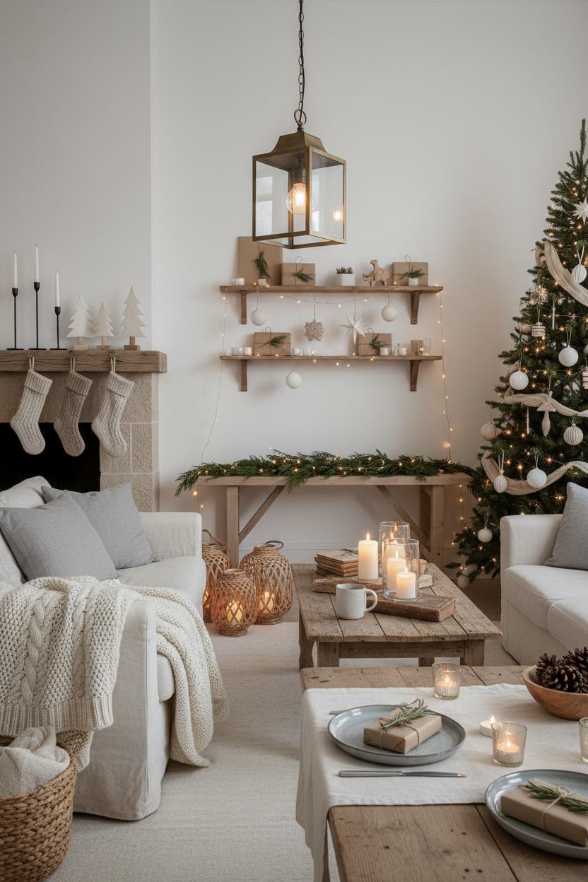 Start with the tree: a simple spruce or even a sparse, sculptural faux tree dressed in paper ornaments, wood beads, and a whisper of eucalyptus garland for that fresh, botanical moment. Swap colorful bulbs for warm fairy string lights, wrapping them loosely so the light feels like a glow instead of a spotlight. Tuck flameless candles into lanterns and along the mantel, then add knit christmas stockings in creamy oatmeal or soft gray so the texture does the decorative heavy lifting. A woven basket of throws, a stacked pile of birch logs, and sprigs of cedar in a stoneware jug bring in those warm-wood notes that make scandi christmas feel grounded and welcoming without the clutter.
