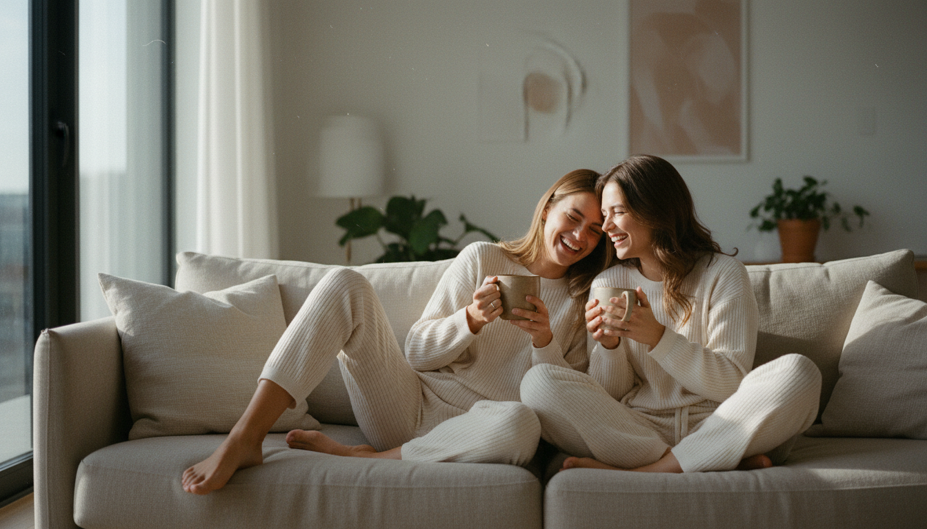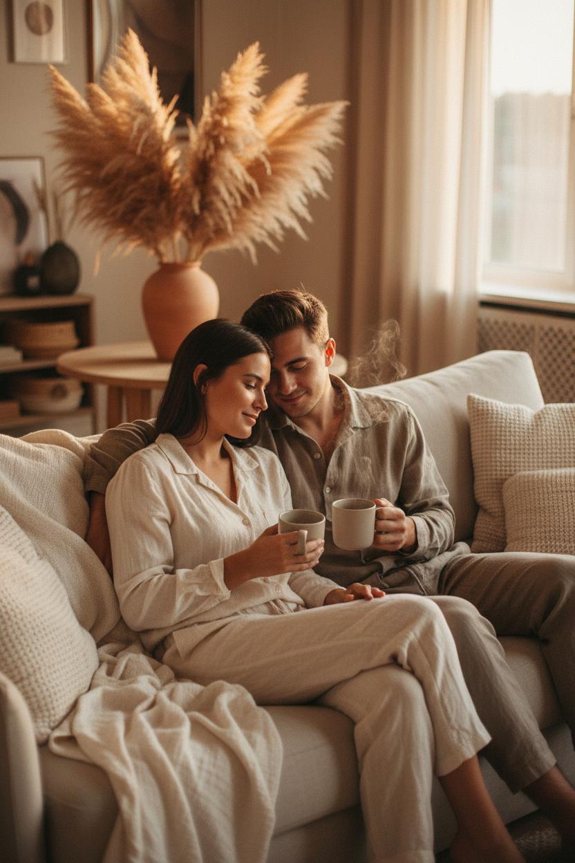 When you’re ready to capture it, lean into candid photography tricks: set a timer, tuck your phone on a stack of books, and forget about it. Hold your mugs with both hands, brush knees, laugh into the rim—tiny gestures read beautifully on camera. Scatter a couple of books on the coffee table, nestle the ceramic coffee mugs set on a tray, and drape that neutral throw blanket with a little deliberate mess. If you’ve layered a beige sofa cover, let it wrinkle; if the pampas grass decor sheds a few plumes, leave them—it all adds to the lived-in calm. Stick to a neutral palette—latte, sand, cream—so skin tones glow and the mugs become the grounding detail. Matching outfits don’t need to be identical; coordinating textures in a linen loungewear set or soft tees keeps things cohesive without feeling staged. The result is a warm, easy snapshot of togetherness: two people, a shared ritual, and the kind of cozy couple photos you’ll want to revisit every Sunday.