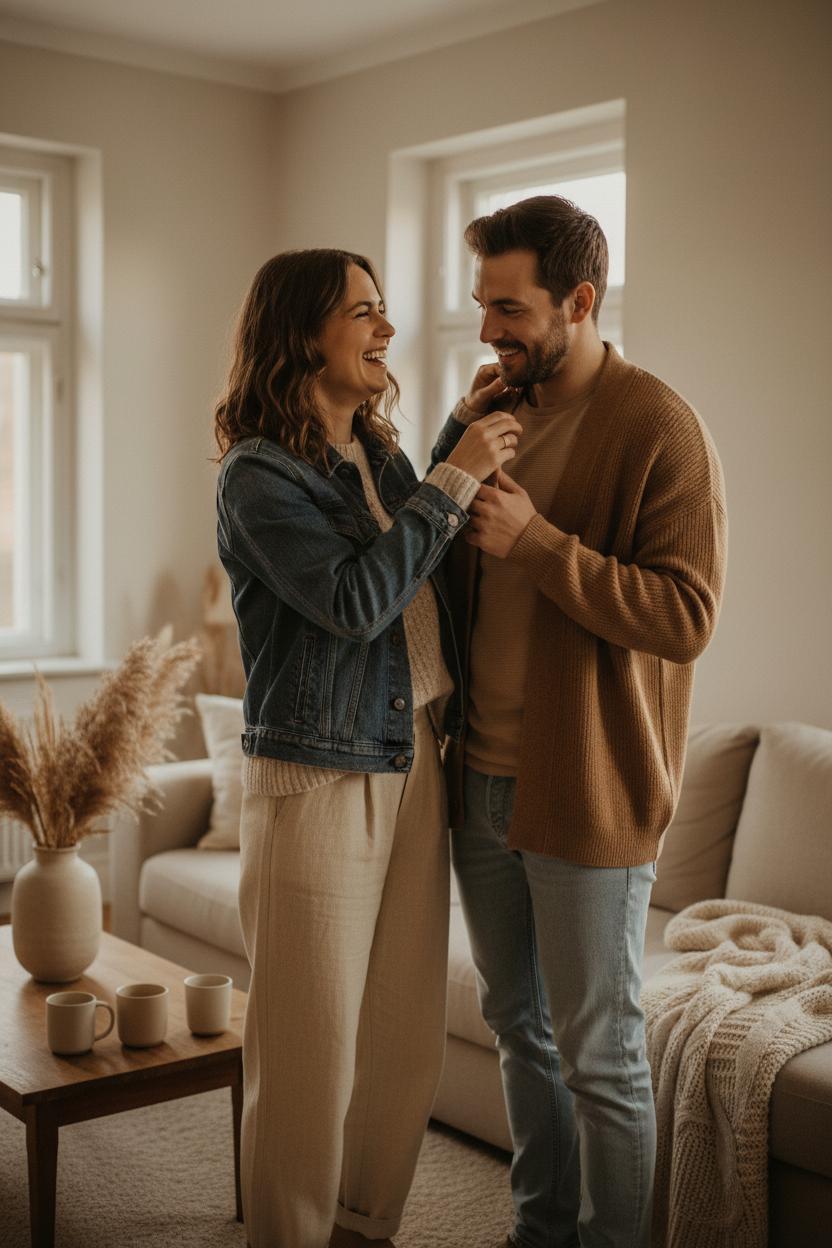 Set the scene with neutral home decor so your outfits remain the star without competing backgrounds. A beige sofa cover softens the room and reflects light, a neutral throw blanket adds cozy texture, and a ceramic coffee mugs set gives you something to hold so your hands look natural. A vase of pampas grass decor brings height and movement to the frame without stealing attention. Keep your colors in the same family—ecru, camel, taupe, faded indigo—so your matching outfits glide from a denim morning to a loungey afternoon seamlessly. For prompts, try slow sways to your favorite song, pouring coffee for each other, or tucking a strand of hair behind a ear—tiny actions that read intimate. If you’re shooting on a phone, stand near a window, lock focus on faces, and slightly underexpose for soft skin tones; later, warm the whites and mute saturation to keep everything cohesive. From denim layers to a linen loungewear set, your wardrobe and space can whisper the same story: calm, connected, and irresistibly photogenic.